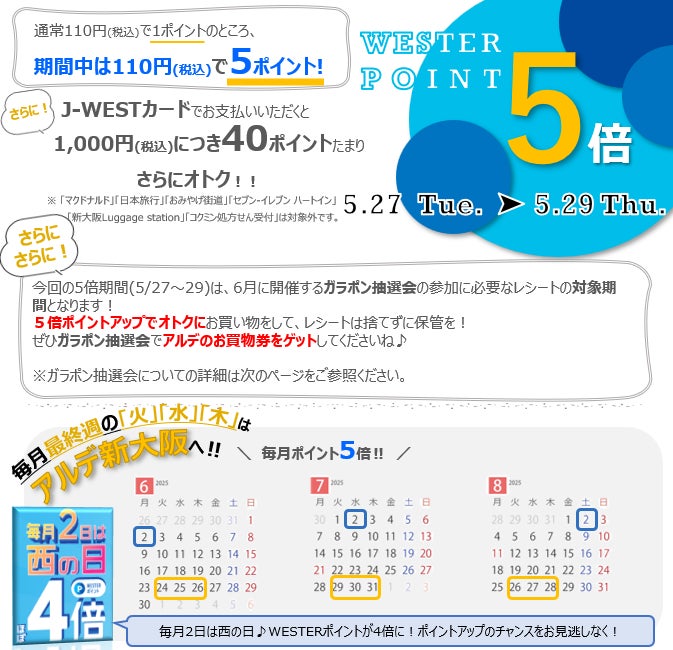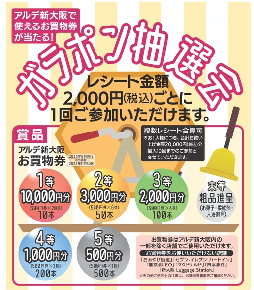 上記期間中に発行されたアルデ新大阪でのお買物レシート税込2,000円(合算可能)ごとに1回抽選会に参加できます!
