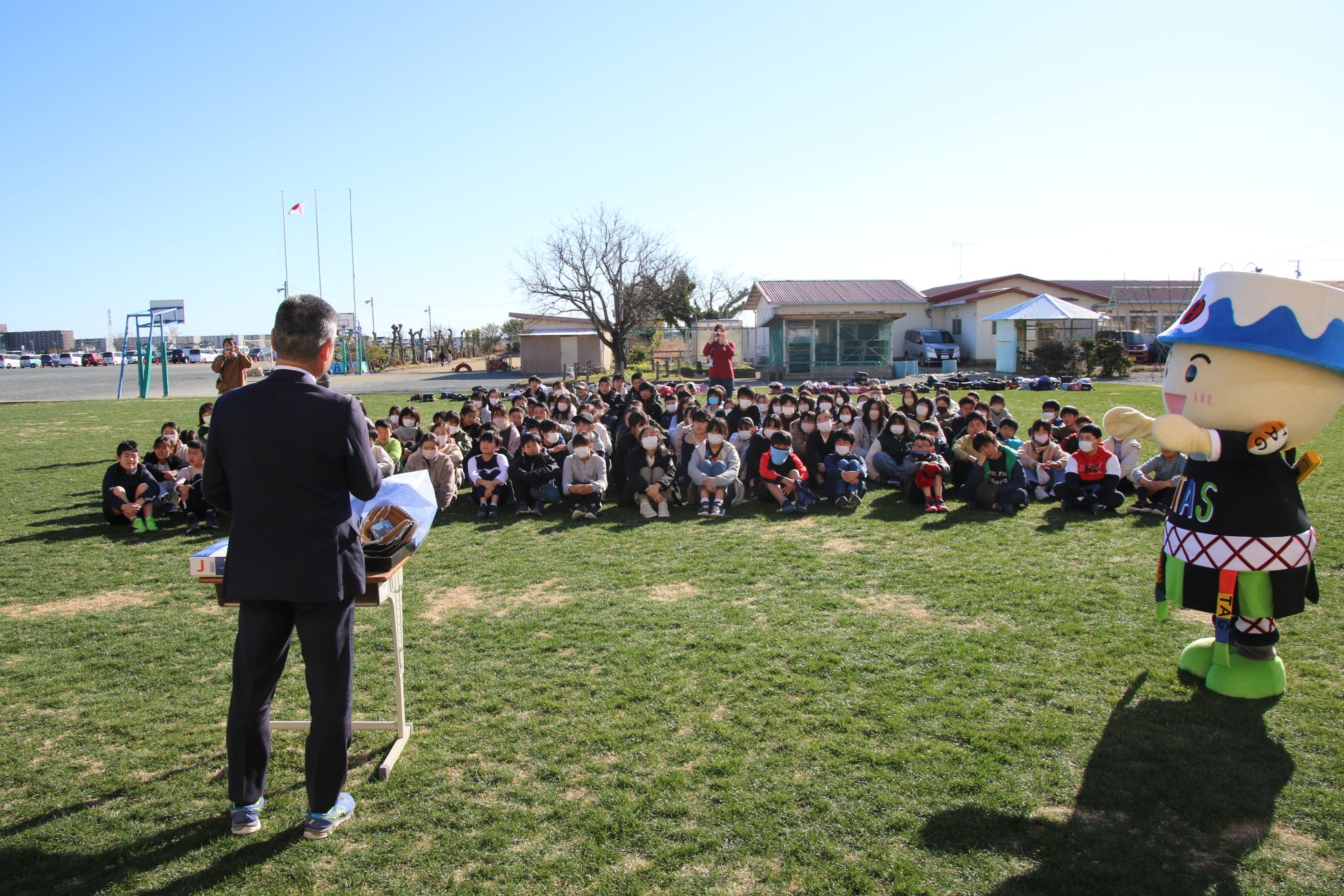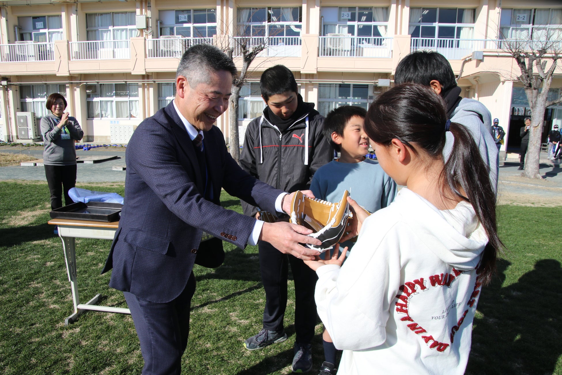 児童たちにはグローブが届くことを秘密にしていたため、学校を代表して校庭に集められた6年生に校長先生がサプライズ発表すると、歓声が上がりました。