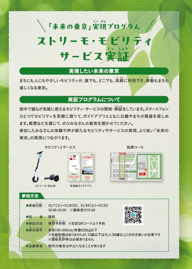 街中で誰もが気軽に使えるモビリティ・サービスの開発・検証を行います。スマートフォンひとつでモビリティを気軽に借りて、ガイドアプリとともに公園やまちの周遊を楽しめます。参加したみなさんの体験や声が新たなモビリティやサービスの実現、より良い「未来の東京」の実現につながります。
