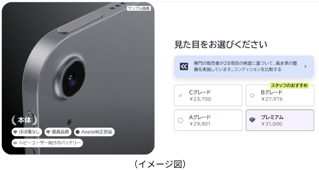 世界最大級のリファービッシュ電子機器に特化したマーケットプレイスであるBack Market Japan株式会社(本社:東京都渋谷区 以下、Back Market)は本日、スマートフォンカテゴリーで導入されている「プレミアムグレード」のオプション追加を、タブレット製品に拡大したことを発表しました。対象となるタブレット製品は、iPad、iPad mini, iPad Proシリーズとなります。プレミアムグレードはBack Marketで提供できる最上級の外観を誇るグレードであり、端末はApple純正部品を使用しているほか、バッテリー容量90%以上を保証し、長時間の使用でも快適なパフォーマンスを発揮します。他のグレードと比較して、特に厳格な基準をクリアした特定の販売者のみがプレミアムグレードを出品しています。リファービッシュ品とは、中古品として回収された電子機器を専門家が検査・クリーニング・修理し、全ての機能で正常作動が確認されている整備済製品となります。
