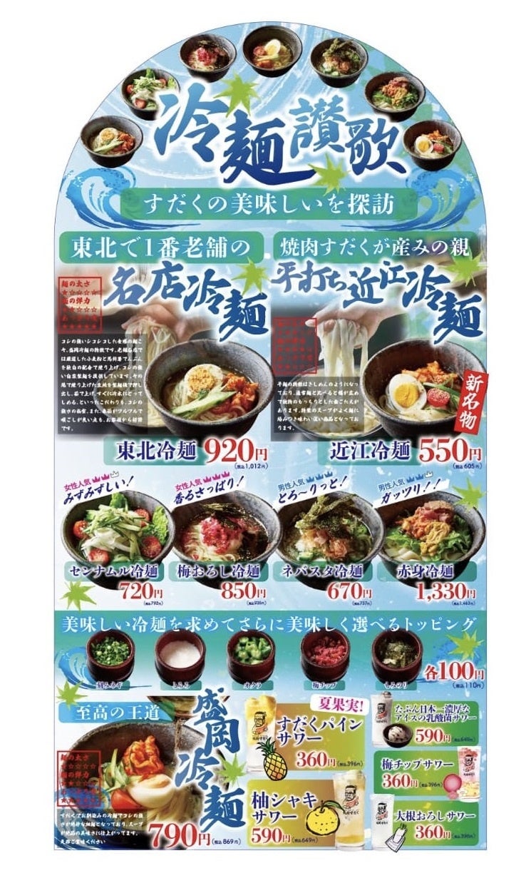 新名物「近江冷麺」をはじめとする、涼やかな夏限定メニューをお楽しみいただけます。焼肉すだくでは、例年、新卒入社若手メンバーによる商品開発が年に4回企画開催されます。