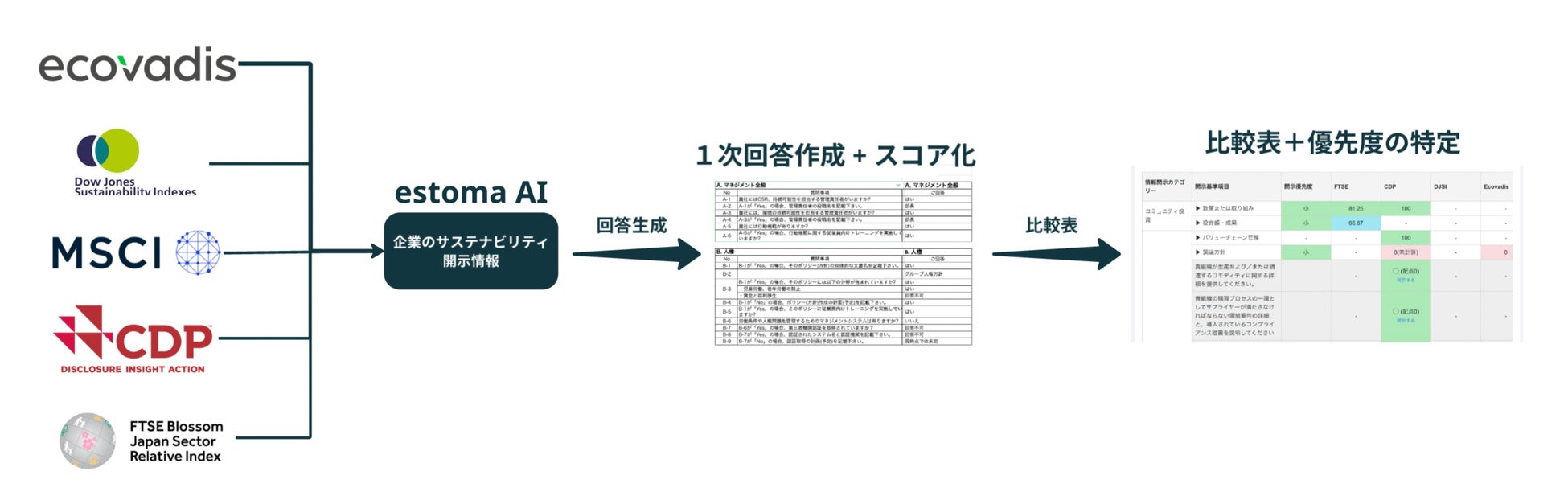 estomaでは、企業のサステナビリティページや統合報告書などの開示情報をもとに、専用のAIモデルを構築。増加する質問票や高度化するESG設問に対して、AIが自動で最適な回答を生成します。