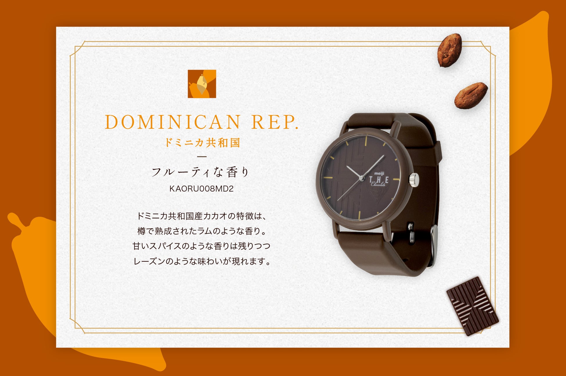 この取り組みに賛同し、明治 THE Chocolateの提案する「チョコレートを五感で愉しむ」の“香り”に同じく着目していた、香りに包まれるフレグランスウォッチ・KAORUがコラボレーション。3つの産地それぞれのカカオが持つ香味をイメージし、身に着けるためのフレグランスへと共同開発しました。