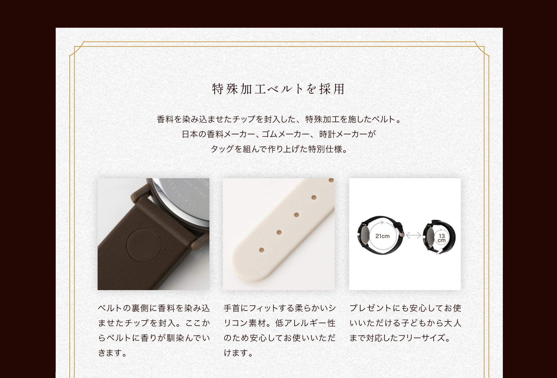 日本の情景が思い出されるような、気品があってどこか懐かしい、 ほのかな香りをオリジナル調合し、特殊加工を施したベルトにとじ込めました。 日本を代表する心安らぐ和の香りは、手にされた方の視覚と嗅覚を刺激します。