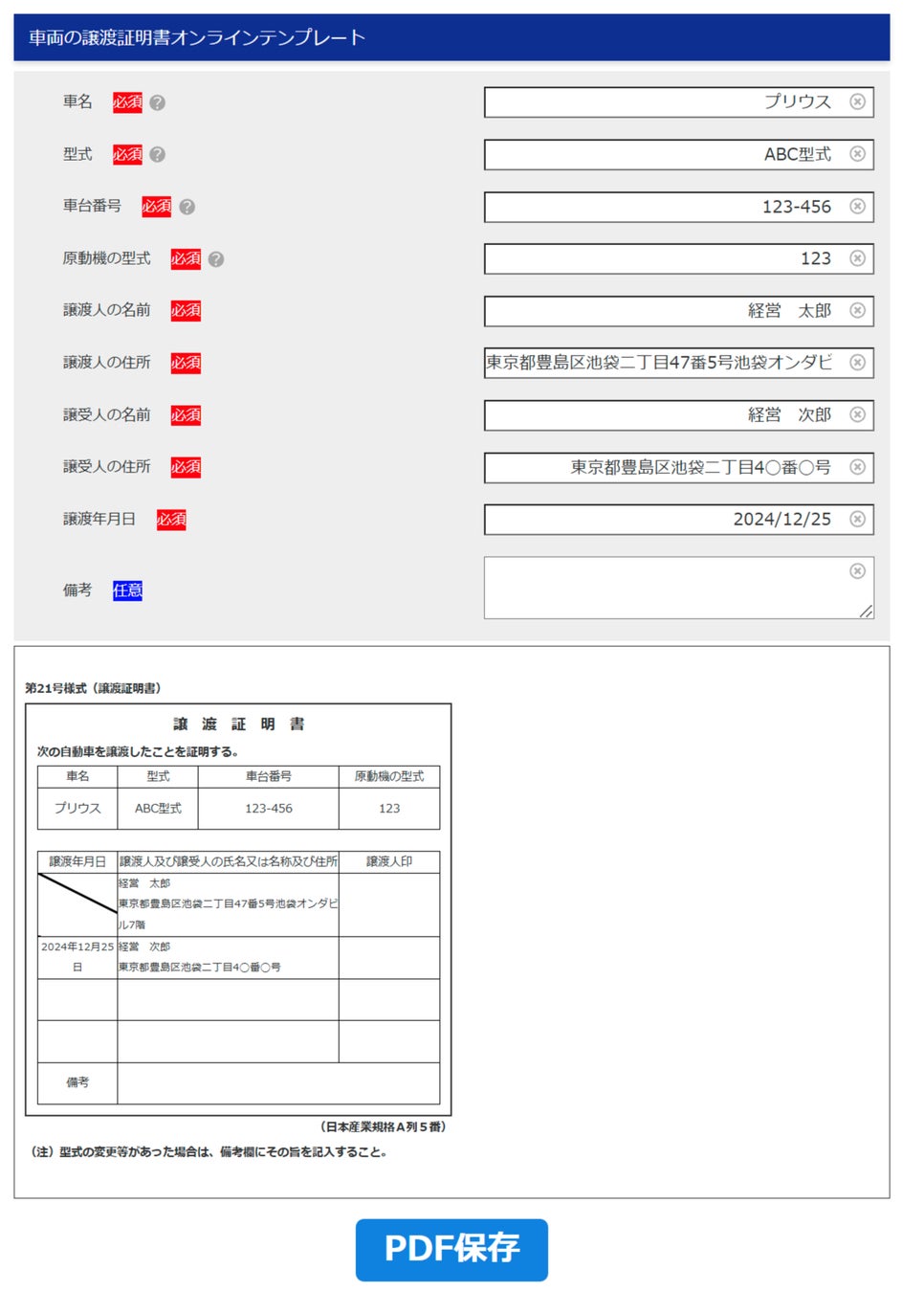 車両の譲渡証明書オンラインテンプレートは、車両の情報と譲渡人・譲受人の情報を入力することで利用できます。
