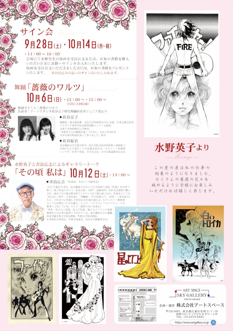 水野英子と旧知の仲でもある音楽家・少女漫画研究家でもある青島広志とのギャラリートーク。水野の展示作品に囲まれながら、この二人のアーティストだからこそ気兼ねなく話せる距離感の近いアットホームな内容でお送りいたします。