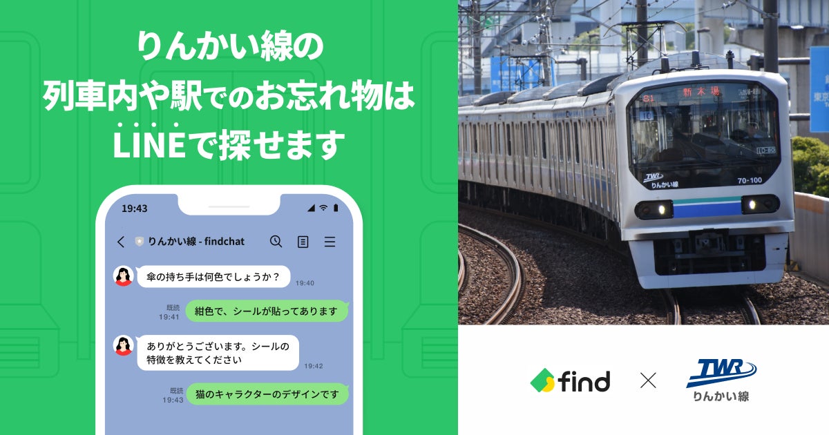東京臨海高速鉄道株式会社(本社:東京都港区、代表取締役社長:西倉 鉄也、以下「りんかい線」)は、株式会社find(本社:東京都中央区、代表取締役CEO:高島 彬、以下「find」)が提供する「落とし物クラウドfind」を導入します。