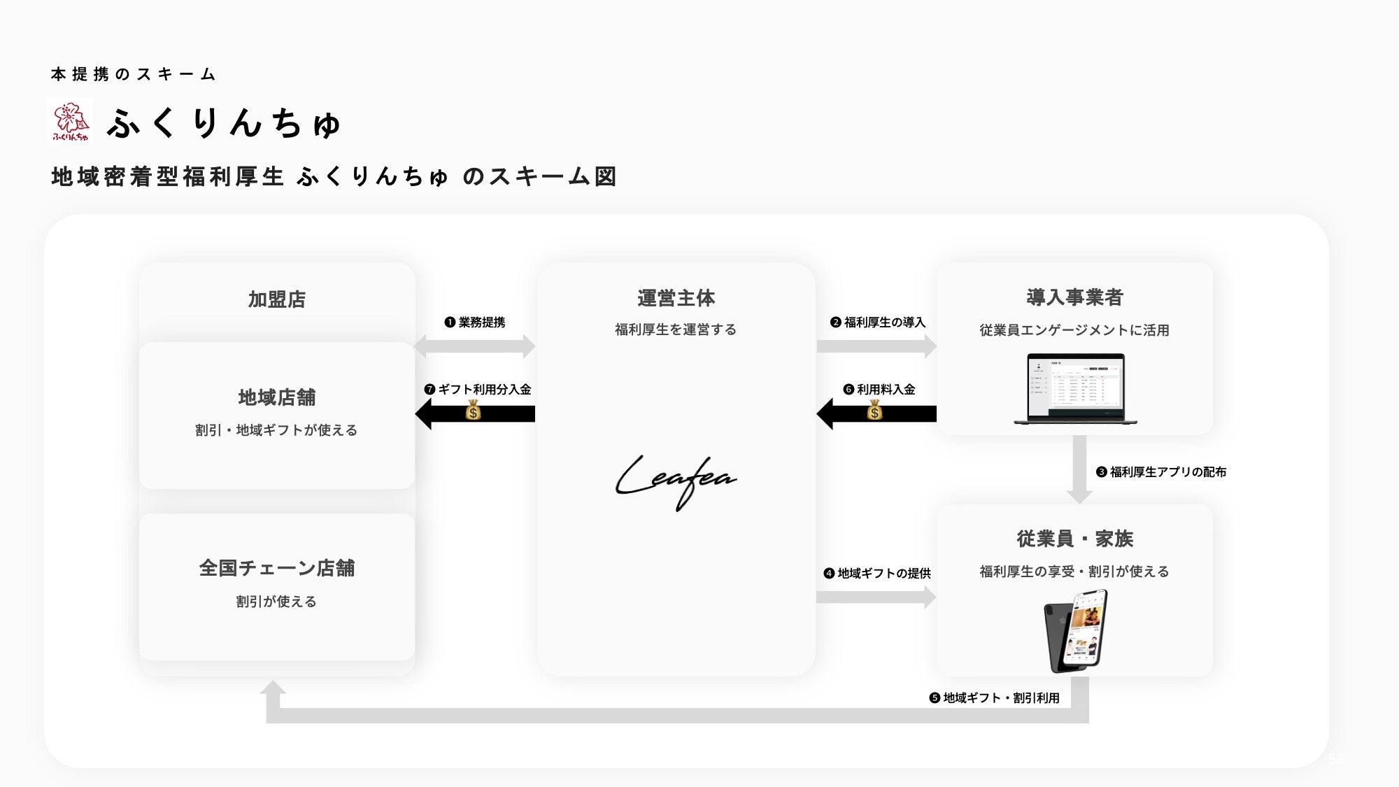 リーフィが提供する地域密着型福利厚生サービス(専用アプリ名称:「ふくりんちゅ」)は、第三の賃上げと言われる企業の従業員向け福利厚生の充実のため、アプリを通じて従業員へのギフト還元や従業員の家族も利用できるクーポンの提供、および導入いただいた企業で働く従業員の働きがいやエンゲージメント向上を支援する内容となっています。