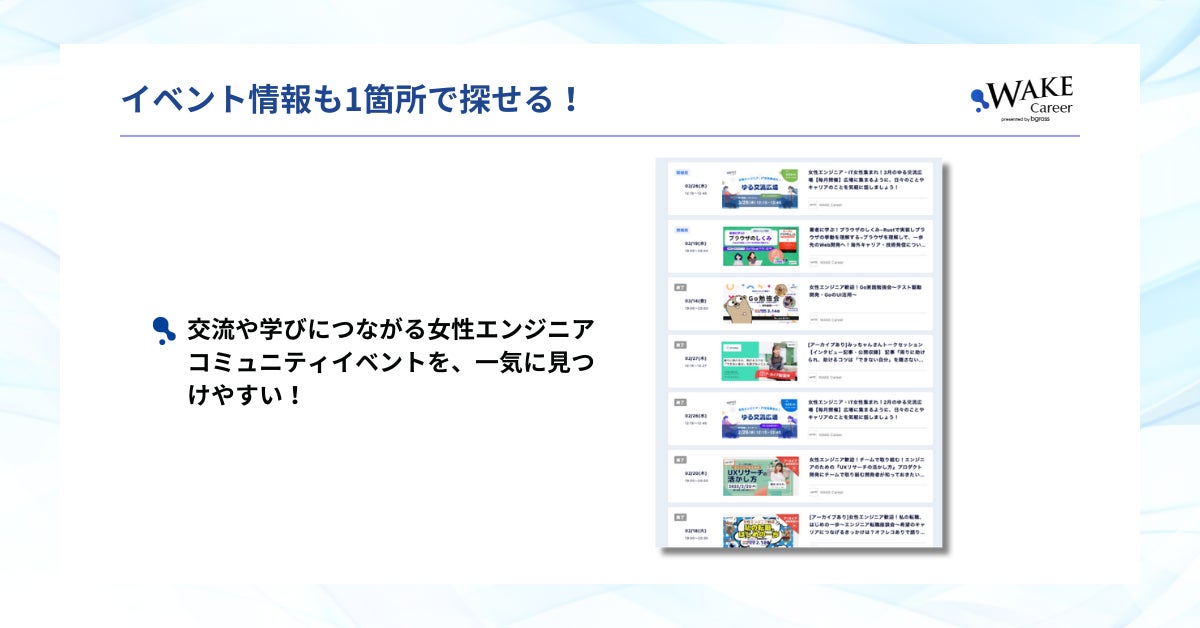 WAKE Careerのプラットフォーム上では、各コミュニティのイベント情報を一覧で確認できるようにし、興味のあるイベントにスムーズにアクセスできるようにします。