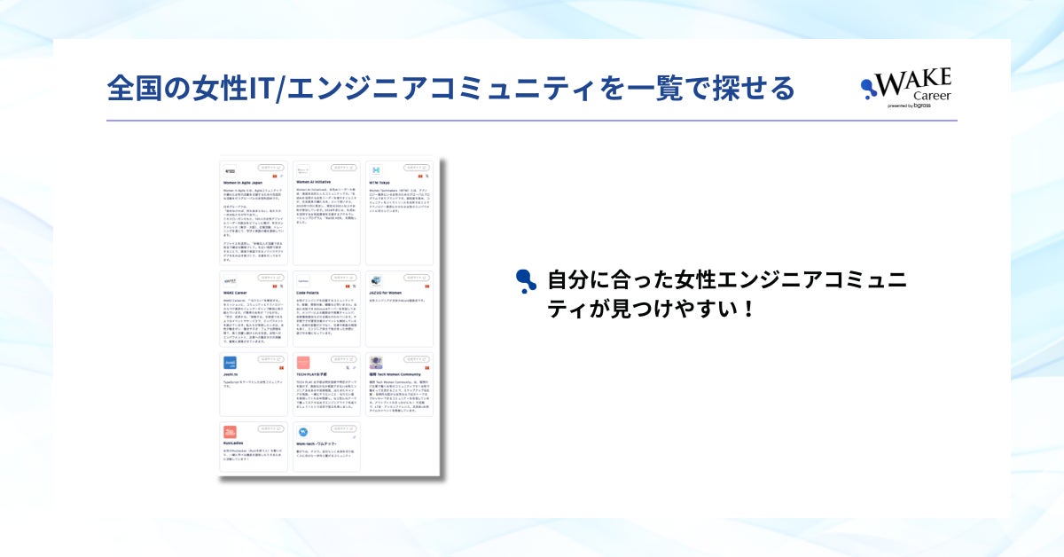 WAKE Careerでは、全国の女性IT/エンジニアコミュニティを一つのプラットフォーム上に集約し、簡単に検索・参加できる仕組みを提供します。