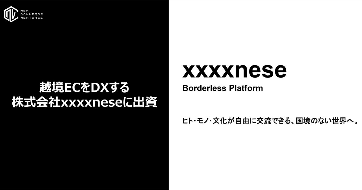 New Commerce Ventures株式会社(本社:東京都品川区、代表取締役:松山馨太・大久保洸平)は、「Borderless Platform ヒト・モノ・文化が自由に交流できる、国境のない世界をつくる。」をミッションとし、越境ECのDXを手掛ける株式会社xxxxnese(本社:千葉県千葉市、代表取締役:厳 盛日、樋口 智丈)に出資しましたので、お知らせいたします。