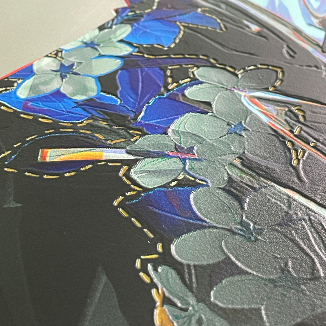 細かい凹凸はJohn Kafka氏の作品の繊細さが際立つ表現に仕上がっています。メタルそのものとマットに仕上げる部分を使い分けることで輝きの強弱を見ることができるのはMCAならでは表現です。