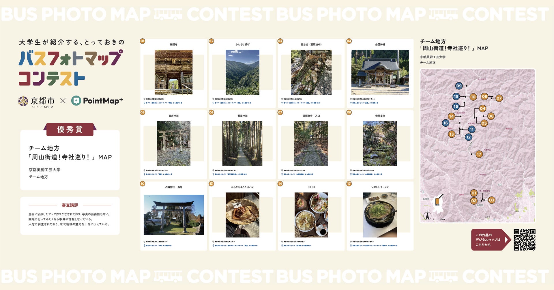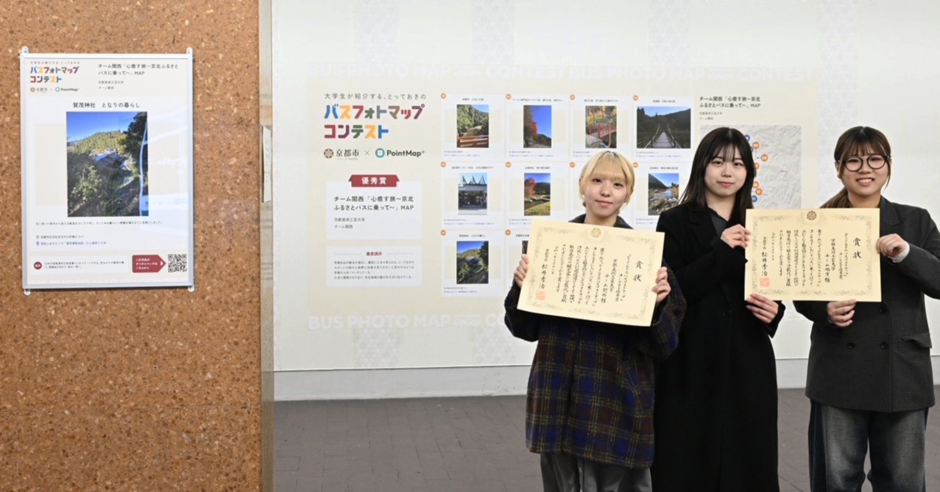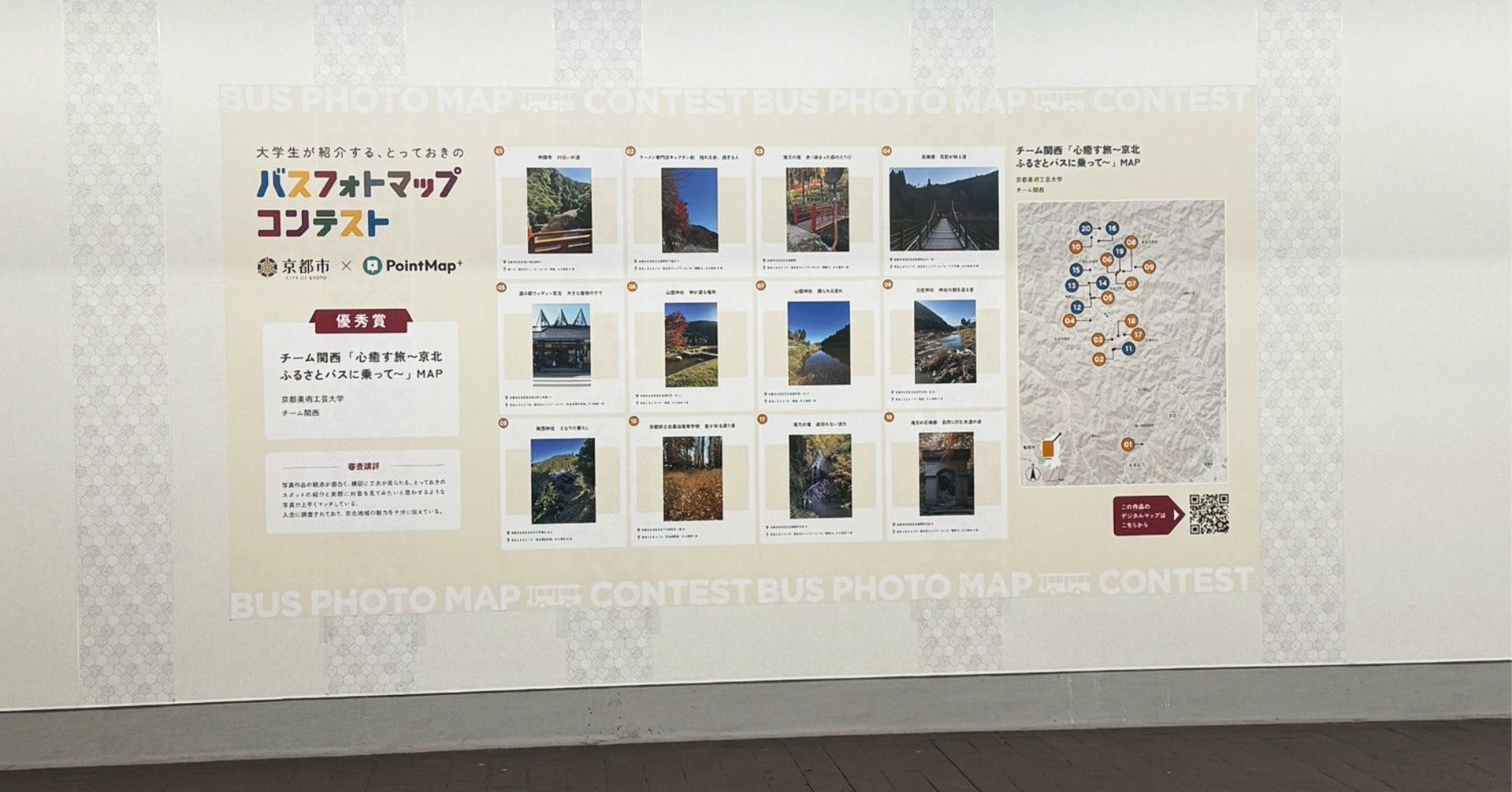 スタートアップ企業として京都市の取り組みに参画し、『大学生が紹介する「とっておきのバスフォトマップ」コンテスト』において、『PointMap+』の活用および展示エリアの空間デザインを担当しました。