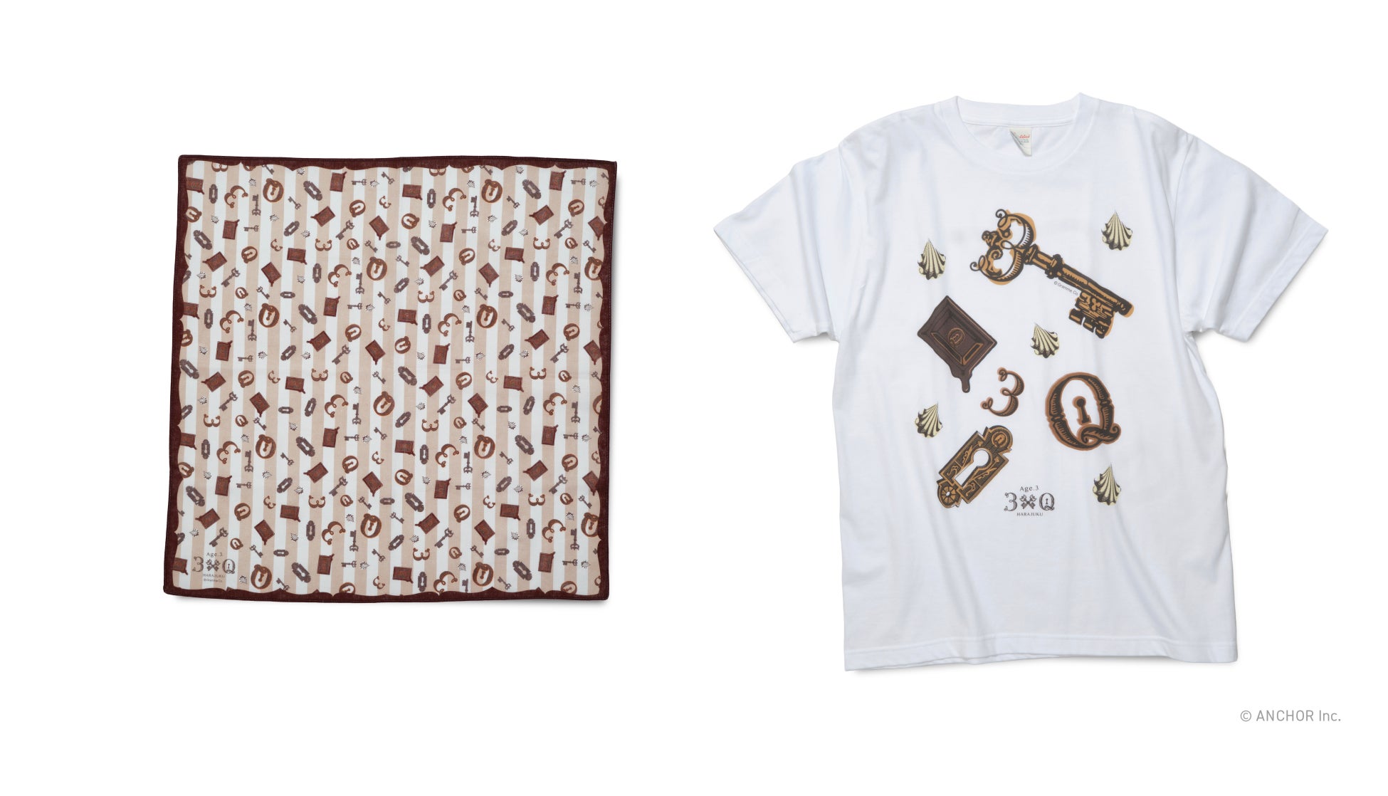 Q-ROOMS.の世界観とAge.3ロゴを掛け合わせたTシャツ、バンダナ、トートバッグ、扇子の4