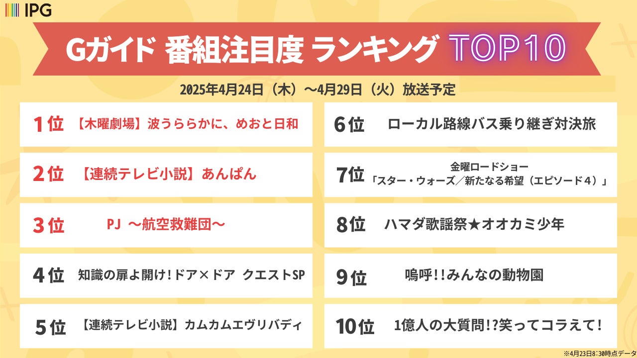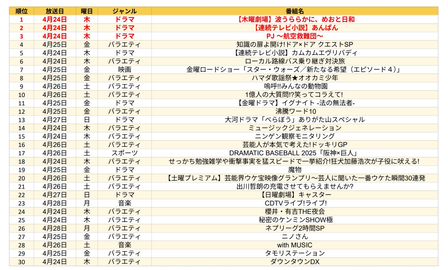 【注目度ランキング】2025年4月24日(木)~4月29日(火)放送予定