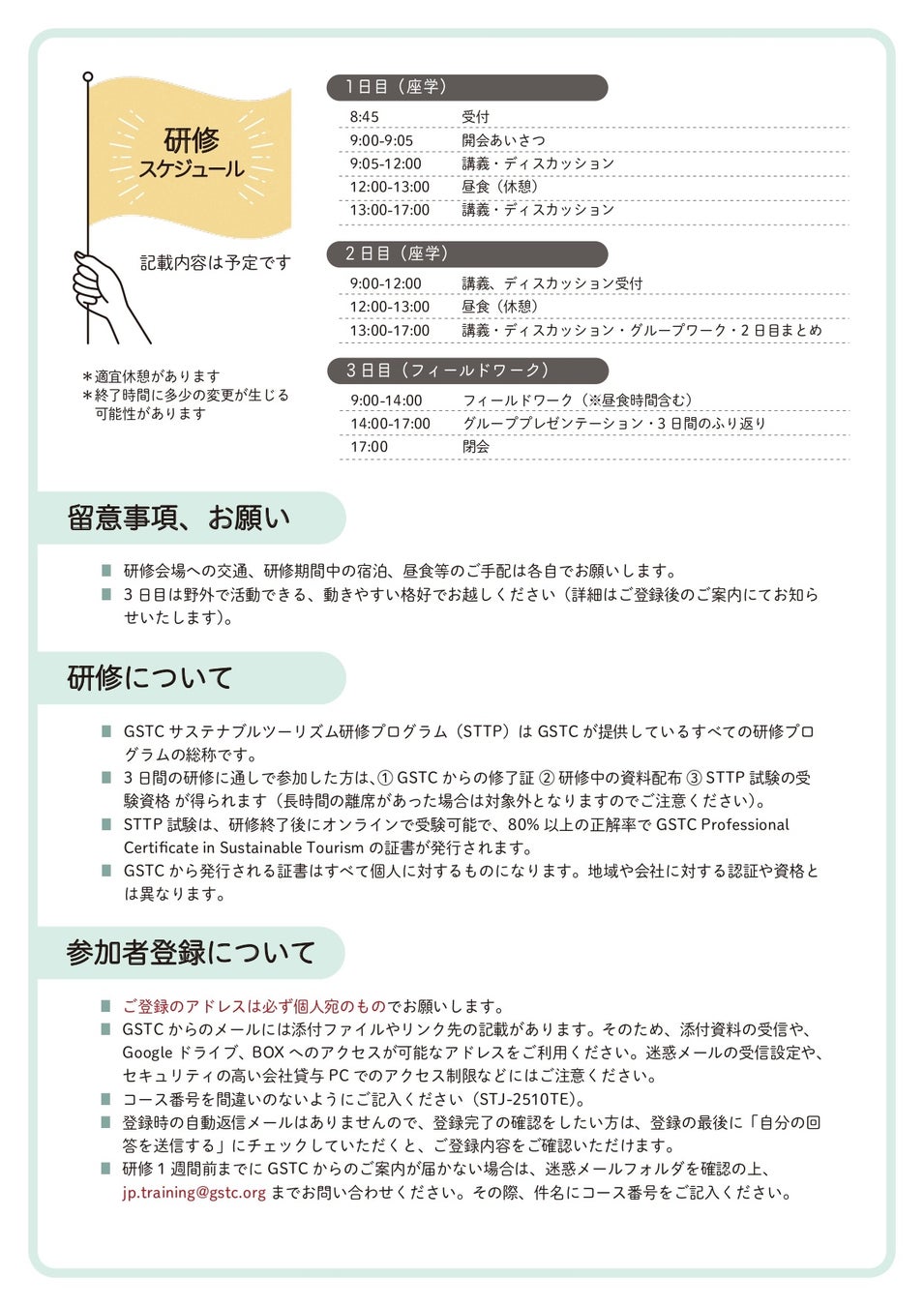 対 象:持続可能な観光の地域づくり、経営、商品造成などに関心があり、3日間を通して研修に