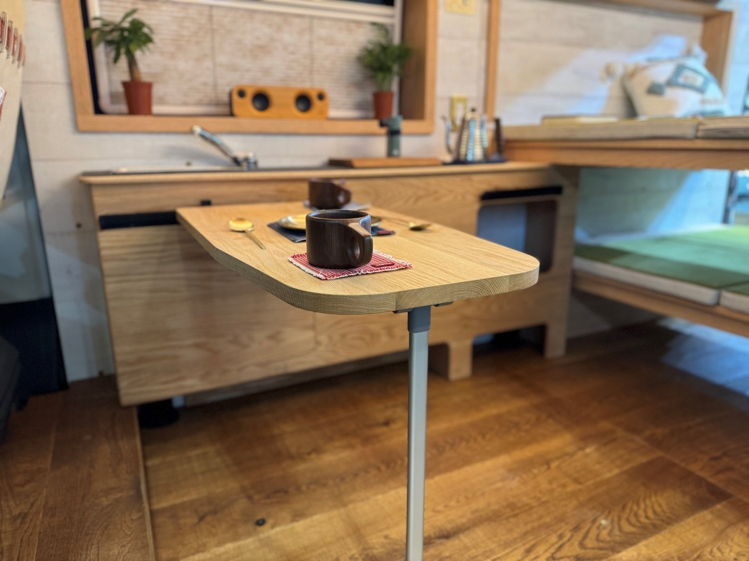 ちょっとした洗い物や手洗い等に活躍するステンレス製のミニシンク(給排水タンク各12L)や、カセットコンロは標準装備。車高の高いフィアットデュカトがベースなので、キッチンカウンターの前に立って作業することも可能です。(室内高1,850mm)