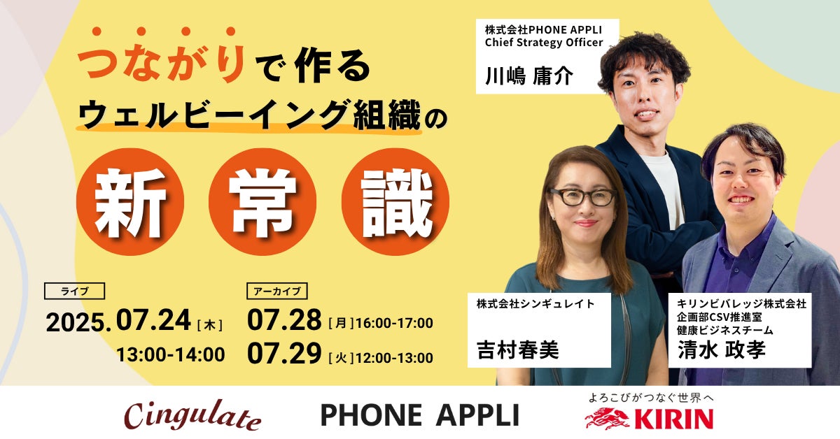 科学とデータの力で組織開発を支援する株式会社シンギュレイト(本社:東京都渋谷区、代表取締役:鹿内 学、以下シンギュレイト)は、キリンビバレッジ株式会社と株式会社PHONE APPLIと共催で『つながりで作るウェルビーイング組織の新常識』を開催します。このセミナーは2025年7月24日(木)13:00~14:00でライブ配信、7月28日(月)16:00~17:00、7月29日(火)12:00~13:00でアーカイブ配信されます。