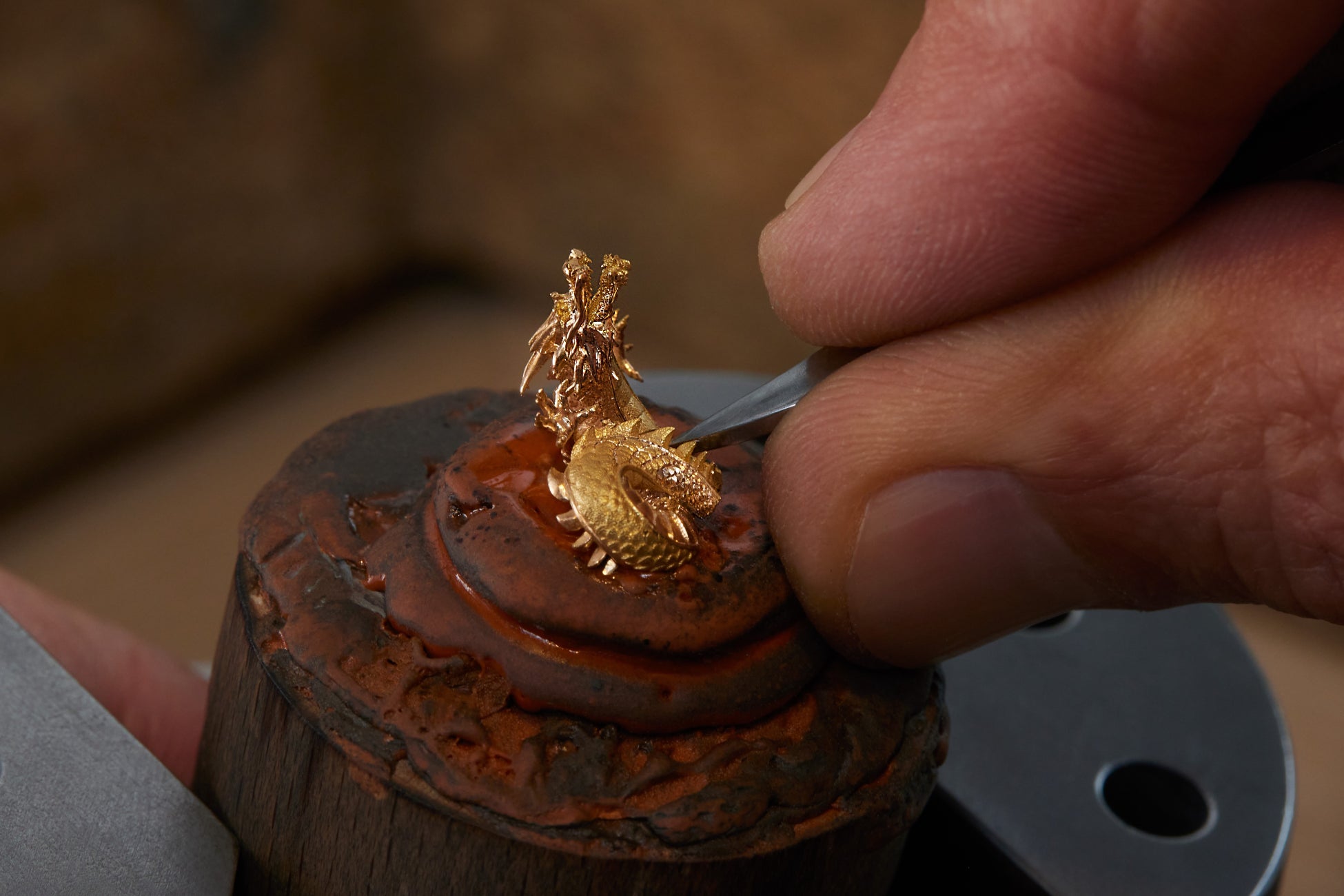 立体的に造形されたドラゴンは、鱗の一枚一枚や面取りされた稜線、宝石のセッティング位置に至るまで精密に仕上げられ、細部の陰影までも計算された造形美を備えています。