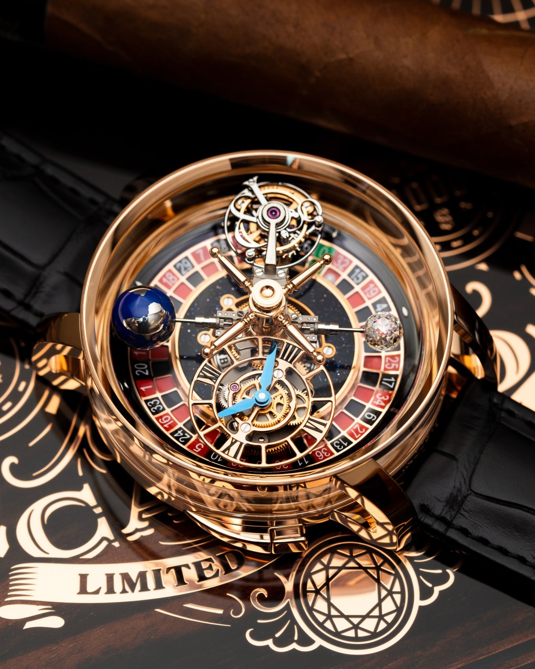 中央の垂直軸を中心に、地球、ダイヤモンドを模した“月”、オフセンターの時刻表示、そして多軸トゥールビヨンを搭載した4本のアームが、それぞれ自転しながら全体で公転を続けます。その下層に配置されたルーレットは、プッシュ操作によってオンデマンドで回転し、時計の中にエンターテインメント性を生み出しています。