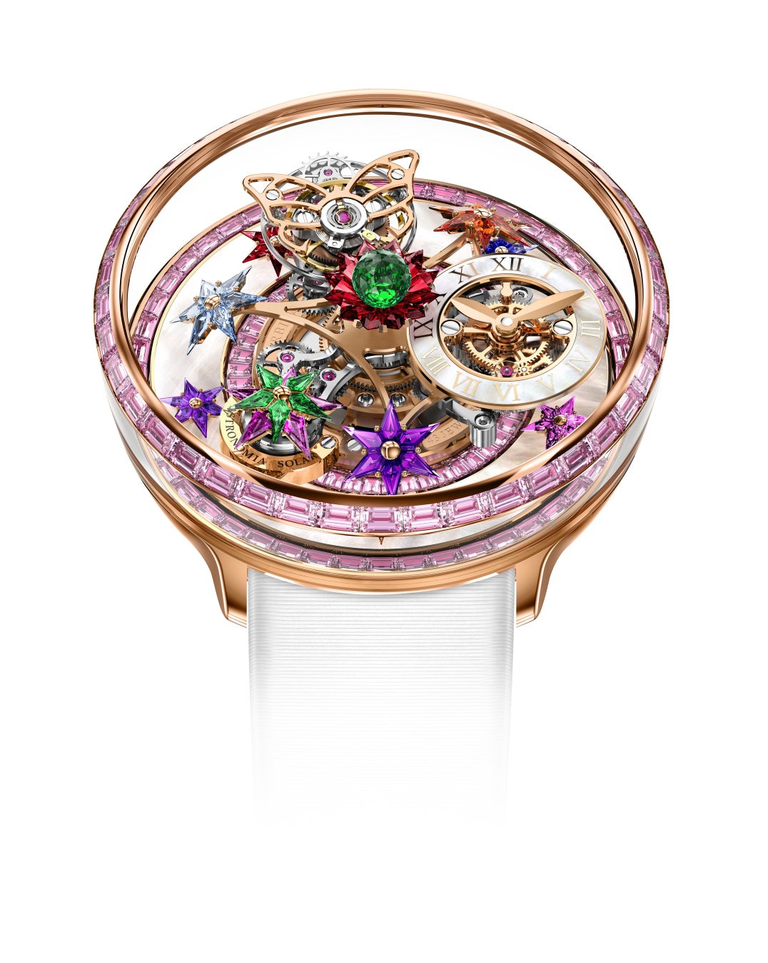 サファイアクリスタルドームの内部では、蝶をかたどったフライングトゥールビヨンが羽ばたくように回転し、その周囲を宝石の花々が10分で一周するプラットフォーム上でゆるやかに咲き誇ります。香り立つような彩色と立体的な造形が、生命の循環――すなわち時間の連続性――を象徴し、視覚・感情・時間が一体化した“静謐な回転庭園”を生み出しています。