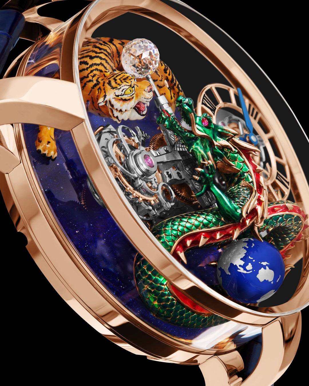 手首のわずかな動きに合わせて光が流れ、彫刻の細部が息づくように輝きを返す。その立体的な芸術性と動的な表情の変化こそ、「アストロノミア ドラゴン」が持つ真の魅力であり、ジェイコブ&コーのクラフトマンシップが到達したひとつの頂点といえます。
