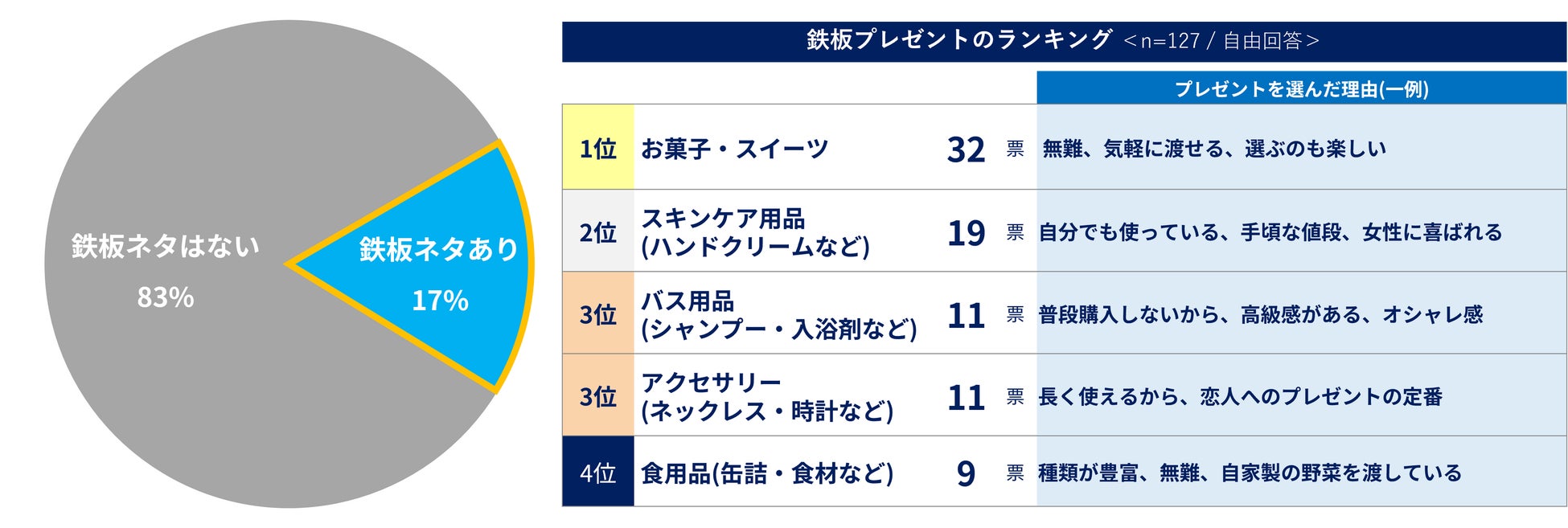 友人、同僚、恋人に贈るプレゼントの鉄板ネタを聞いたところ、全体の17%の方が鉄板ネタを持っていることが分かりました。鉄板ネタのプレゼントでは「お菓子・スイーツ」(32票)が最も多くプレゼントとしての無難さや、気軽さを理由として挙げています。2位には「スキンケア用品」が選ばれハンドクリームや、ハンドソープなど普段から愛用していて相手にもオススメしたい製品をプレゼントしているようです。