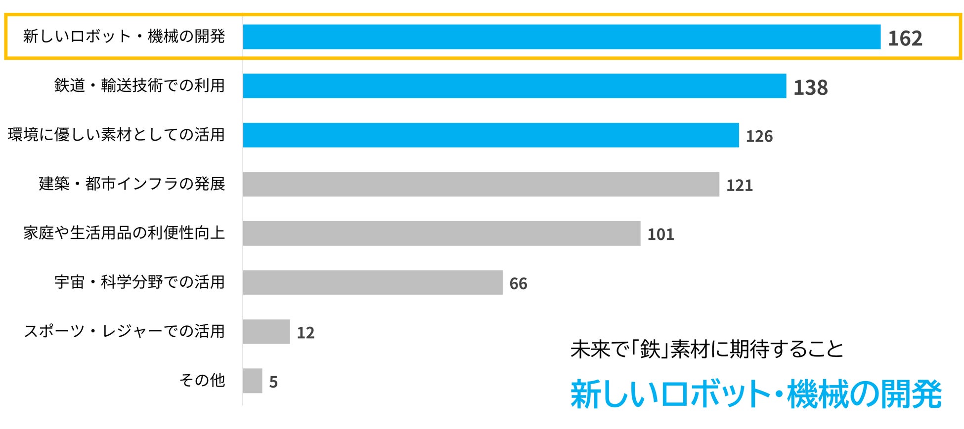 未来で鉄素材に期待することを聞く質問では「新しいロボット・機械の開発」(162票)が最も多い結果となりました。続いて「鉄道・輸送技術での利用」「環境に優しい素材としての活用」が挙げられており、交通インフラや、環境問題に関心が集まっているようです。