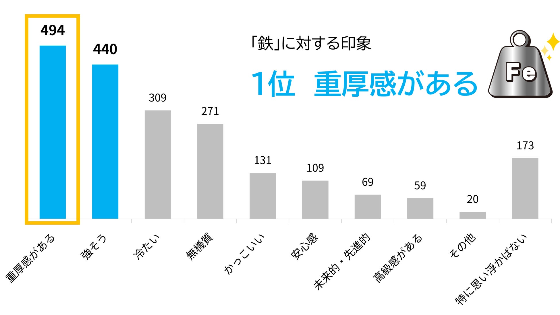 鉄に対する印象を聞く質問では、「重厚感がある」「強そう」が上位にランクイン。鉄は重量があり頑丈な印象が強い金属素材ですが、昨今では技術進歩により軽量化も進んでおり、強度を保ちつつ軽量な鉄素材も増えています。