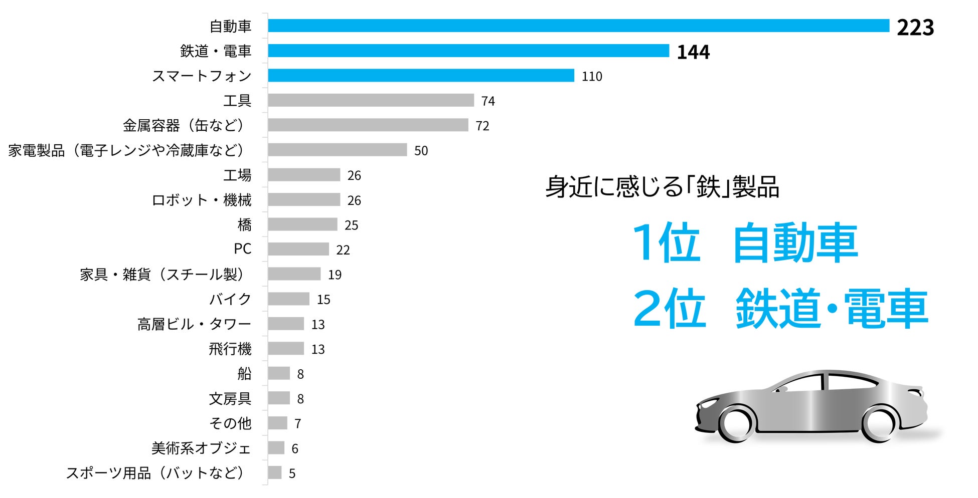身近に感じる鉄製品を聞く質問では「自動車」(223票)が1位に選ばれました。2位の「鉄道・電車」(144票)を含め日常の移動手段として活用している乗り物が最も身近な鉄製品と考えているようです。また、スマートフォンや工具、缶などの金属容器も日用品として鉄製品と認識していることがうかがえます。