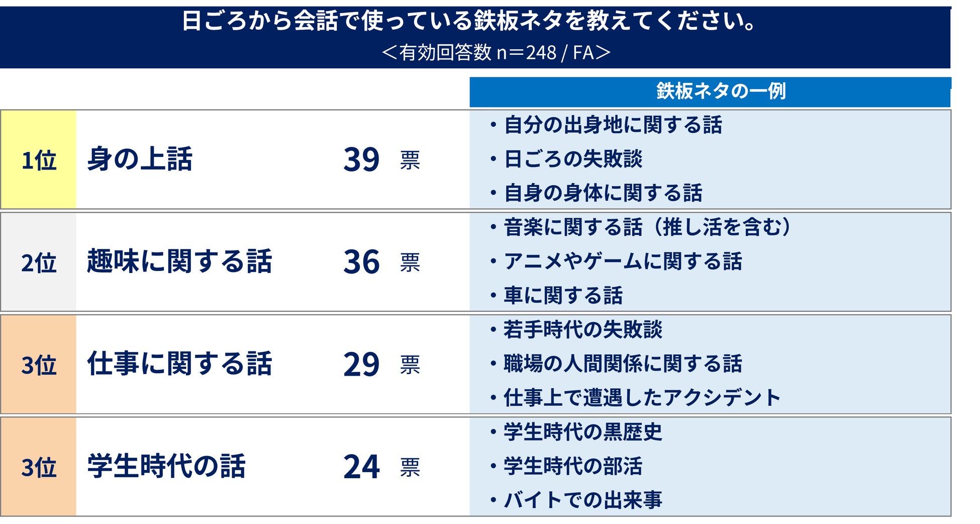 日ごろから会話の中で使っている鉄板ネタを聞く質問では「身の上話」が1位という結果に。日常で起きた失敗談や、自身の出身地などシチュエーションに関わらず話題にしやすいネタが挙げられています。全体的に失敗談を鉄板ネタにする方が多く、円滑なコミュニケーションに有効と考える方が多いようです。