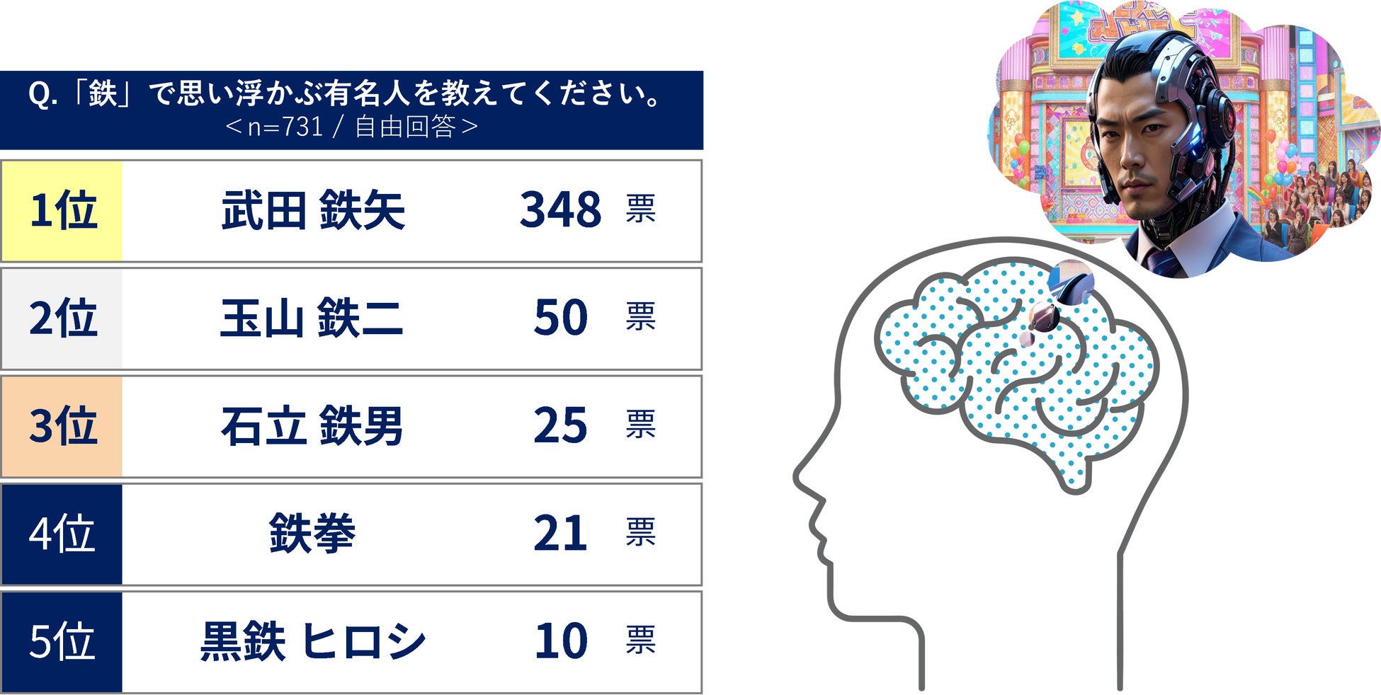 “鉄”で思い浮かぶ有名人を聞く質問では、俳優や歌手など長きにわたってマルチな活躍を続ける「武田 鉄矢」さんが過半数の票を得て1位(348票)に。2位には実力派俳優の「玉山 鉄二」さん、3位には昭和を代表する名俳優である「石立 鉄男」さんがランクインしています。