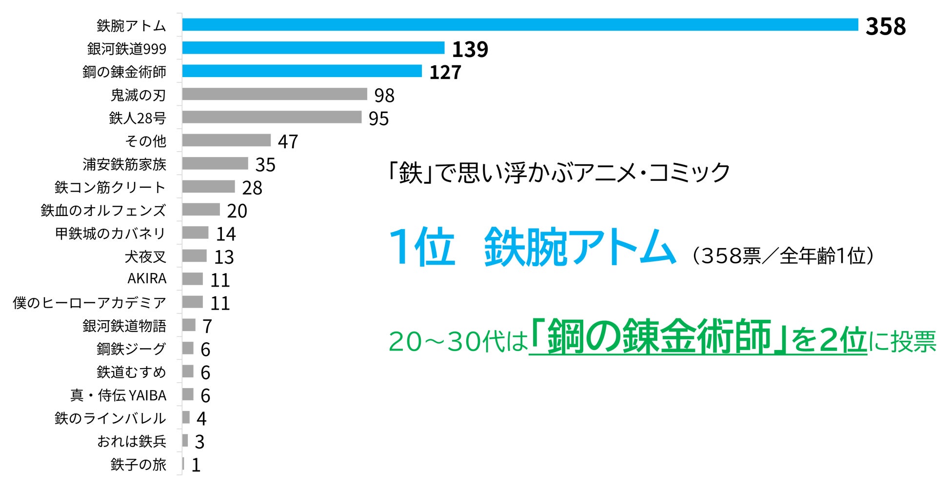 “鉄”と聞いて思い浮かぶアニメ・コミックを聞いたところ、ロボットアニメとして絶大な人気を誇る「鉄腕アトム」が全年齢で1位(358票)となりました2位には「銀河鉄道999」(139票)、3位には「鋼の錬金術師」(127票)がランクインし、20~30代の世代別ランキングでは「鋼の錬金術師」が2位にランクインしています。タイトルに「鉄」が入っていない作品ではキャラクター名や、ストーリーから「鉄」を想起する人が一定数いることが分かりました。