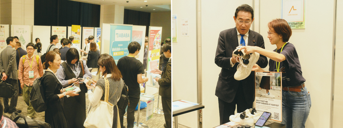 本イベントでは初の試みとなった展示ブースには、正会員51社が出展しました。まさに本イベントの今年のテーマにふさわしい「社会課題の見本市」を体現し、常時たくさんの方でにぎわいを見せていました。基調講演前には、岸田 文雄 元内閣総理大臣も各企業の取り組みについて興味深く展示ブースを視察し、社会課題解決の最前線を体感されていました。
