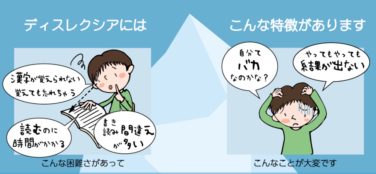 ディスレクシアは、生まれつき大脳の機能の問題で、読み書きが正確にまたはスムーズにできません。知的発達に遅れはありません。まったく読めない書けないわけではないのですが、読み書き中心の授業は疲れやすく、相当な負荷がかかっています。「努力が足りない」「本人が怠けている」と決めつけるのはまちがいです。