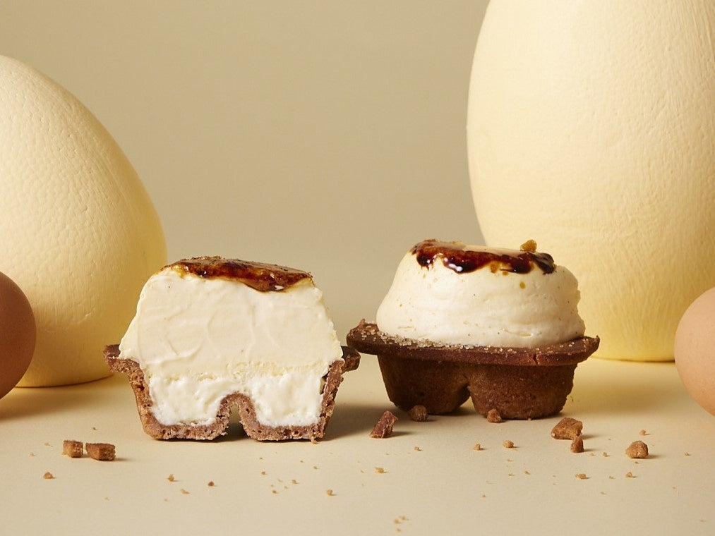 優しい甘さのクレームブリュレとチーズの塩味と旨み、カラメルのほろ苦さが一体となった、卵が主役の味わいです。トップは、バニラの香りとコクのある味わい深さが特徴のブラウンシュガー「カソナード」を、焼きごてでブリュレしました。パリっとした食感で、クリーム層の優しい甘みを引き立てる焦し砂糖の香ばしいほろ苦さが全体の味にアクセントを加えます。ザクザクのクッキーが柔らかくなる前に是非お召し上がりください。