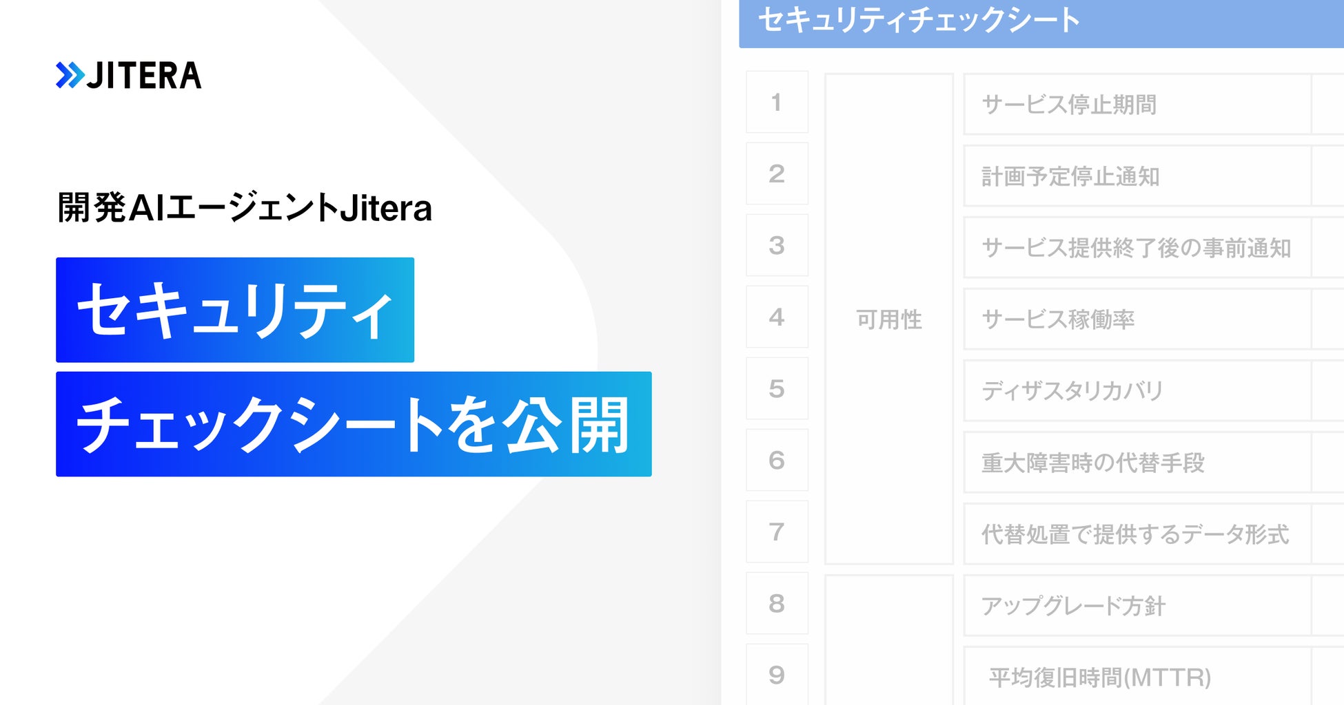 開発AIエージェント「Jitera」を提供する株式会社Jitera(本社:東京都港区、代表取締役:栁澤 直、以下「当社」)は、「Jitera」の導入を検討する企業向けに、「セキュリティチェックシート」を公開しました。