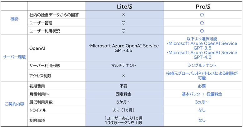 「ID AI コンシェルジュLite版」と「ID AI コンシェルジュPro版」の違いは下記の通りです。