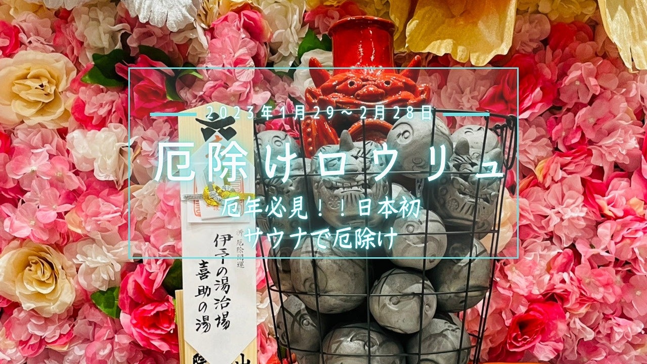 「喜助の湯」では、2023年1月29日(日)~2月28日(火)まで、日本初の“サウナで厄除け”ができる「厄除けロウリュ」を今年も開催します。この企画は、愛媛県今治市にある「やくよけ大師 遍照院」にて厄除け祈祷した菊間瓦製サウナストーン【鬼丸・鬼玉】をサウナストーブで熱し、邪気を祓うと言われる愛媛県内子産の柑橘「じゃばら」エキスを使ったアロマ水を【鬼丸・鬼玉】に掛け、じゃばらエキスを含んだ蒸気を大量に発生させ(ロウリュ)、全身に浴びることで厄払いをするイベントです。2022年には約4万人が来場しました。