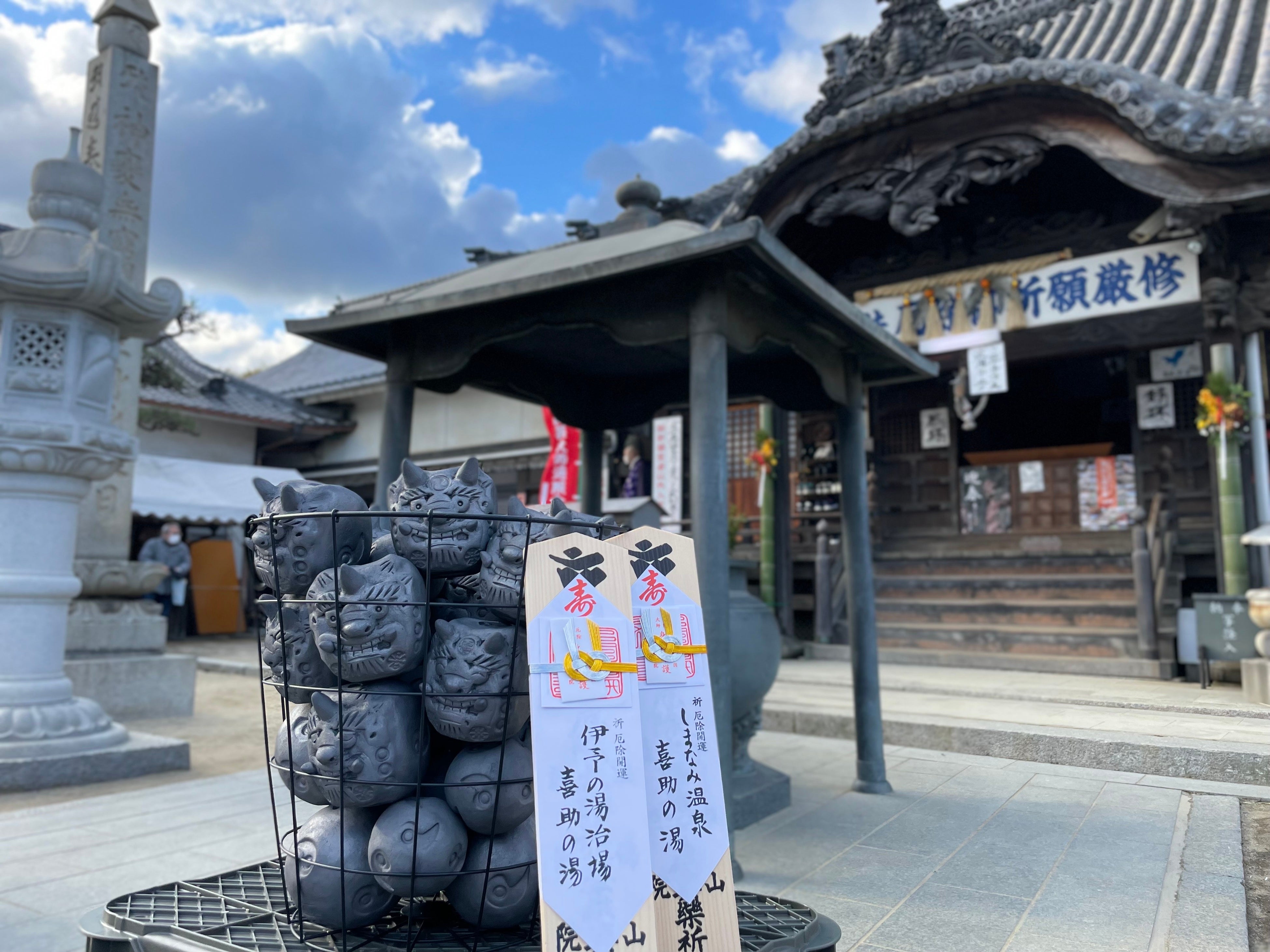 喜助の湯では、製造したサウナストーン「鬼丸」「鬼玉」300個の厄除け祈祷のため、愛媛県今治市菊間町に所在する寺院「やくよけ大師 遍照院」のご協力を得ました。遍照院は、四国八十八箇所番外札所、新四国曼荼羅霊場第42番札所として知られ、厄除大師の別名で親しまれています。弘法大師が42歳の時、自らの厄除けと末代緒人の厄除けのために開いたとされる遍照院は、毎年2月の「節分会厄除大祭」には、大勢の善男善女が、厄除祈願、諸願成就のために参詣します。