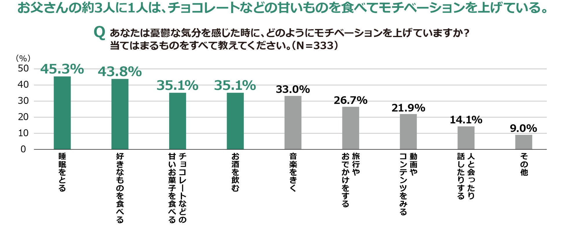 憂鬱な気分を感じた時にどのようにモチベーションを上げているか聞いたところ、「睡眠をとる」(45.3%)、「好きなものを食べる」(43.8%)、「チョコレートなどの甘いお菓子を食べる」(35.1%)、「お酒を飲む」(35.1%)と、主に「睡眠」と「食」がお父さんのモチベーションになっていることがわかりました。