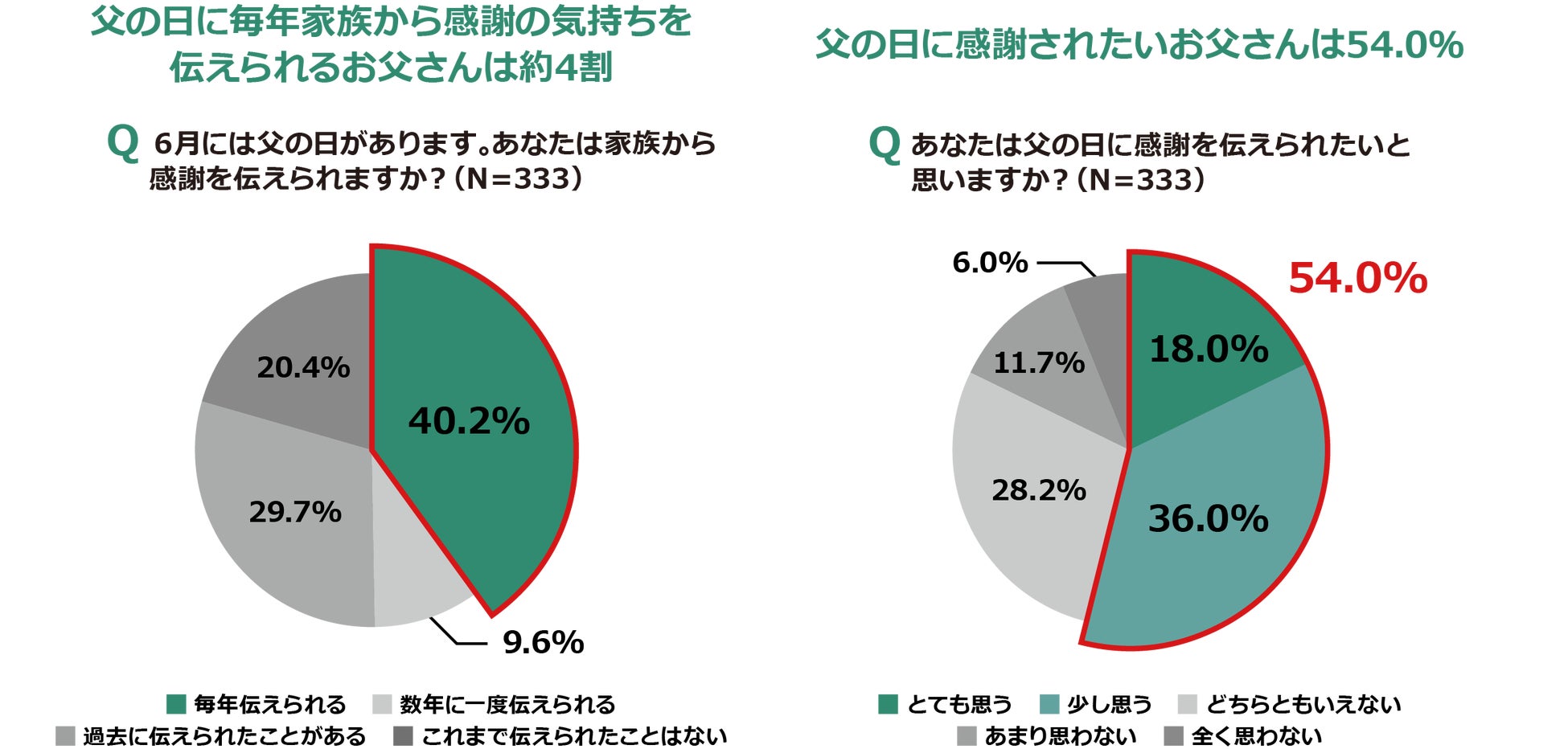 6月にはお父さんが主役のイベント「父の日」があります。父の日に家族から感謝を伝えられるかどうかを聞いたところ、「毎年伝えられる」と回答したお父さんは40.2%にとどまり、2割(20.4%)は「これまで伝えられたことはない」と回答しました。一方で、父の日に感謝を伝えられたいと「とても思う」「少し思う」と回答した人は、実際に伝えられている割合を超える54.0%に上り、半数以上のお父さんが感謝されたいと感じていることが明らかになりました。