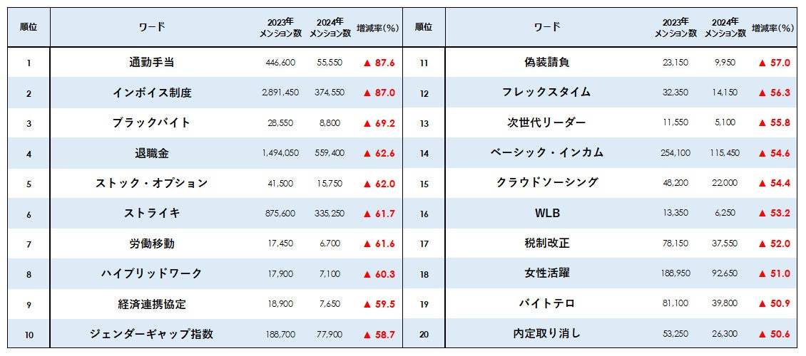 ・ 「通勤手当」は昨年、通勤手当不正受給のニュースが相次いだことで言及が増えたが、今年はその反動で減少。「インボイス制度」も昨年の制度開始から今年は落ち着いたトピック。