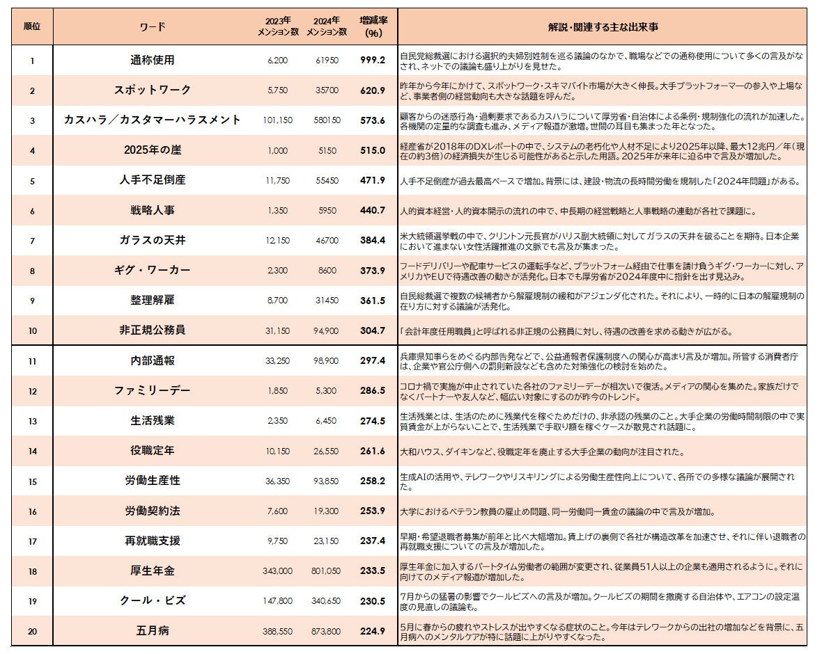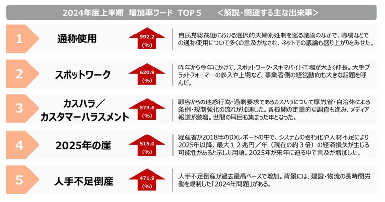 ■2024年度上半期(2024年4月-9月末)における「はたらく」に関する投稿増加率ワードランキングと解説