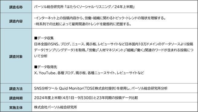 株式会社パーソル総合研究所(本社:東京都港区、代表取締役社長:萱野博行)は、生活者の生の声をリアルタイムに分析する、「はたらくソーシャル・リスニング(2024年度上半期)」を発表いたします。 「はたらく」に関する旬のトピックスについて、各種SNS・ブログ・掲示板・レビューサイトなど、日本国内10万のソーシャルメディアより取得した投稿データ(サンプルデータ)を定期的に分析・発信することで日々変化する労働市場全体の動向理解に資することを目指します。