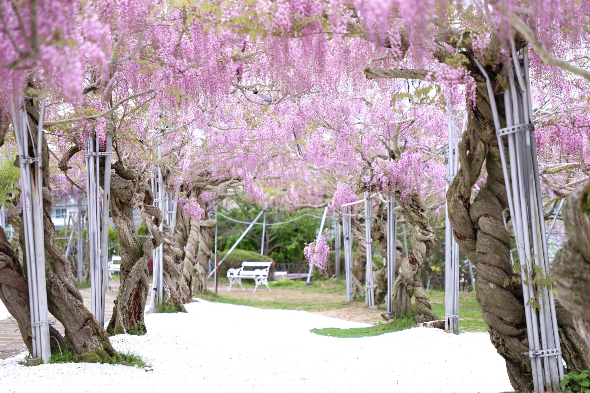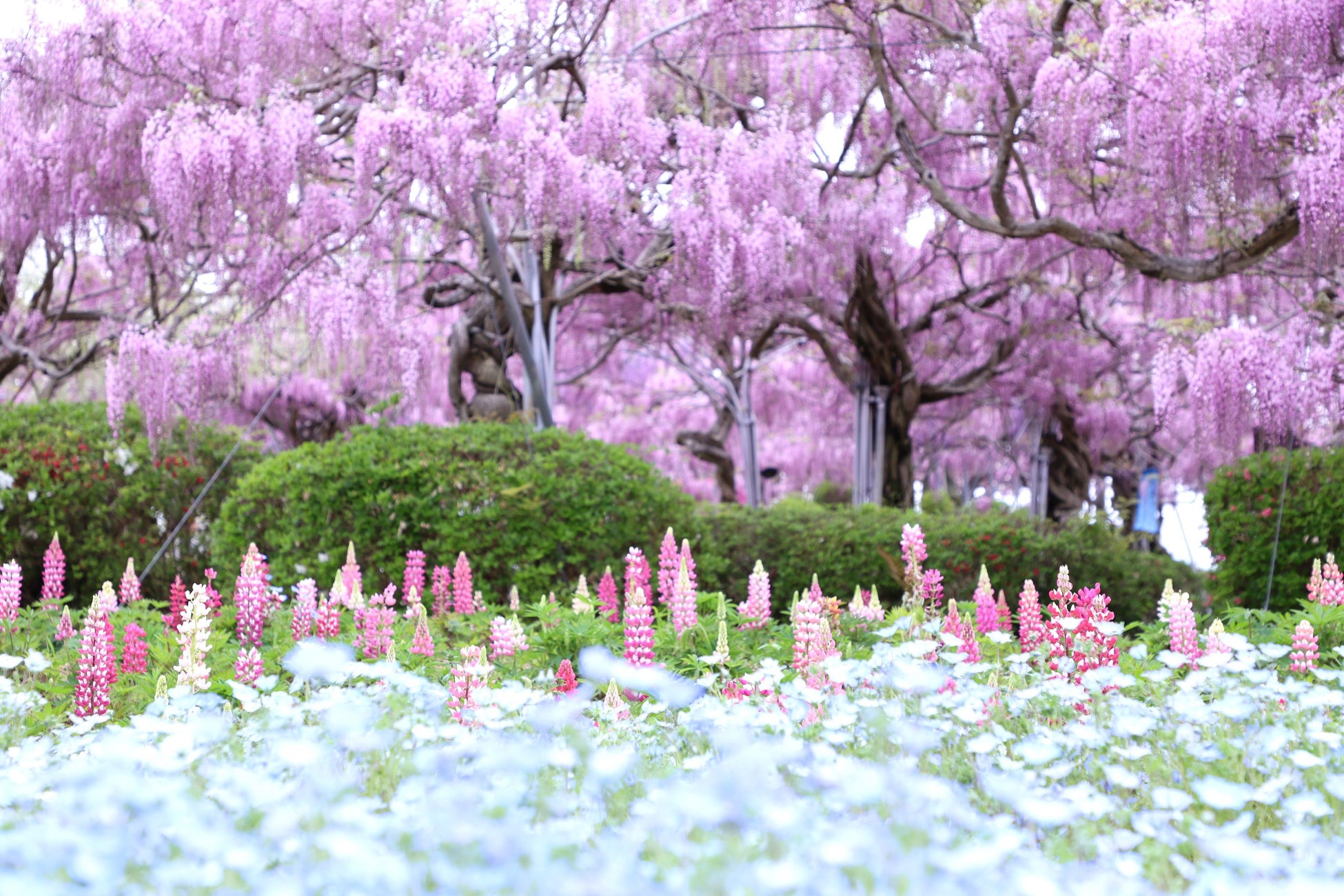 30,000㎡に約1,000本の藤と、昇り藤という別名もあるルピナス12,000株が花開きます。柔らかな藤色に包まれた園内で、ゆったりとした優しい時の流れをお楽しみください。開花状況は公式サイトで公開していきますので併せてご覧ください。