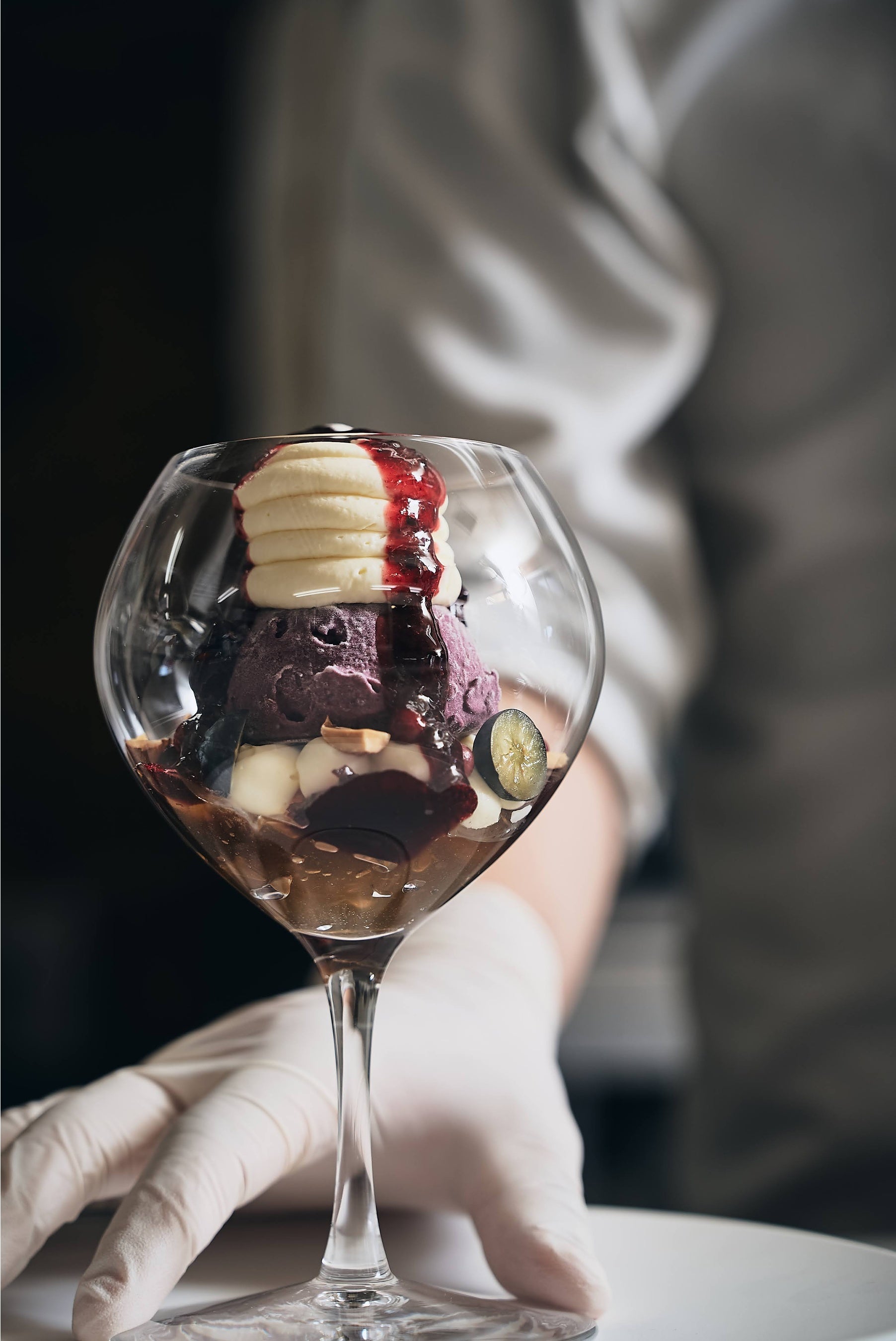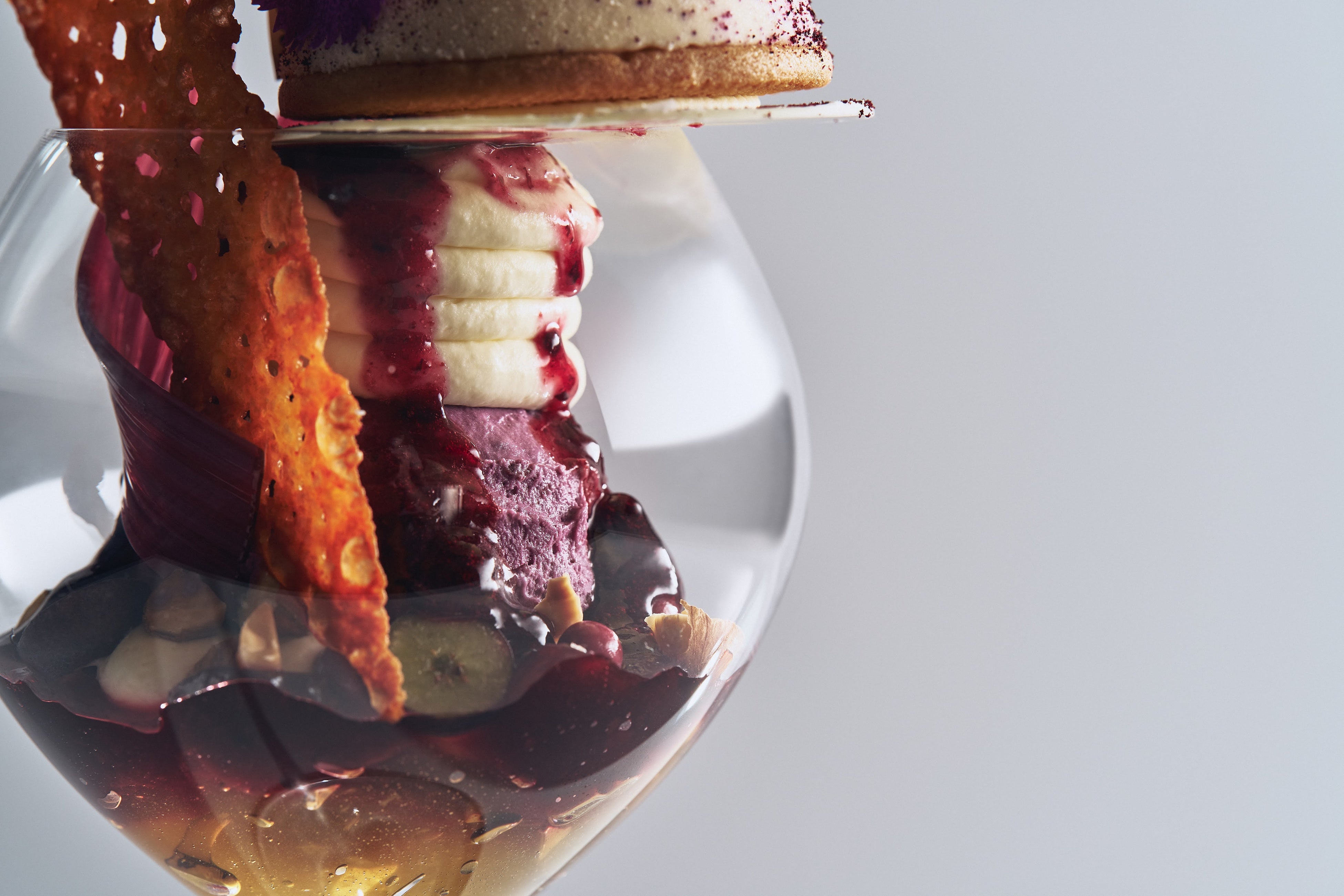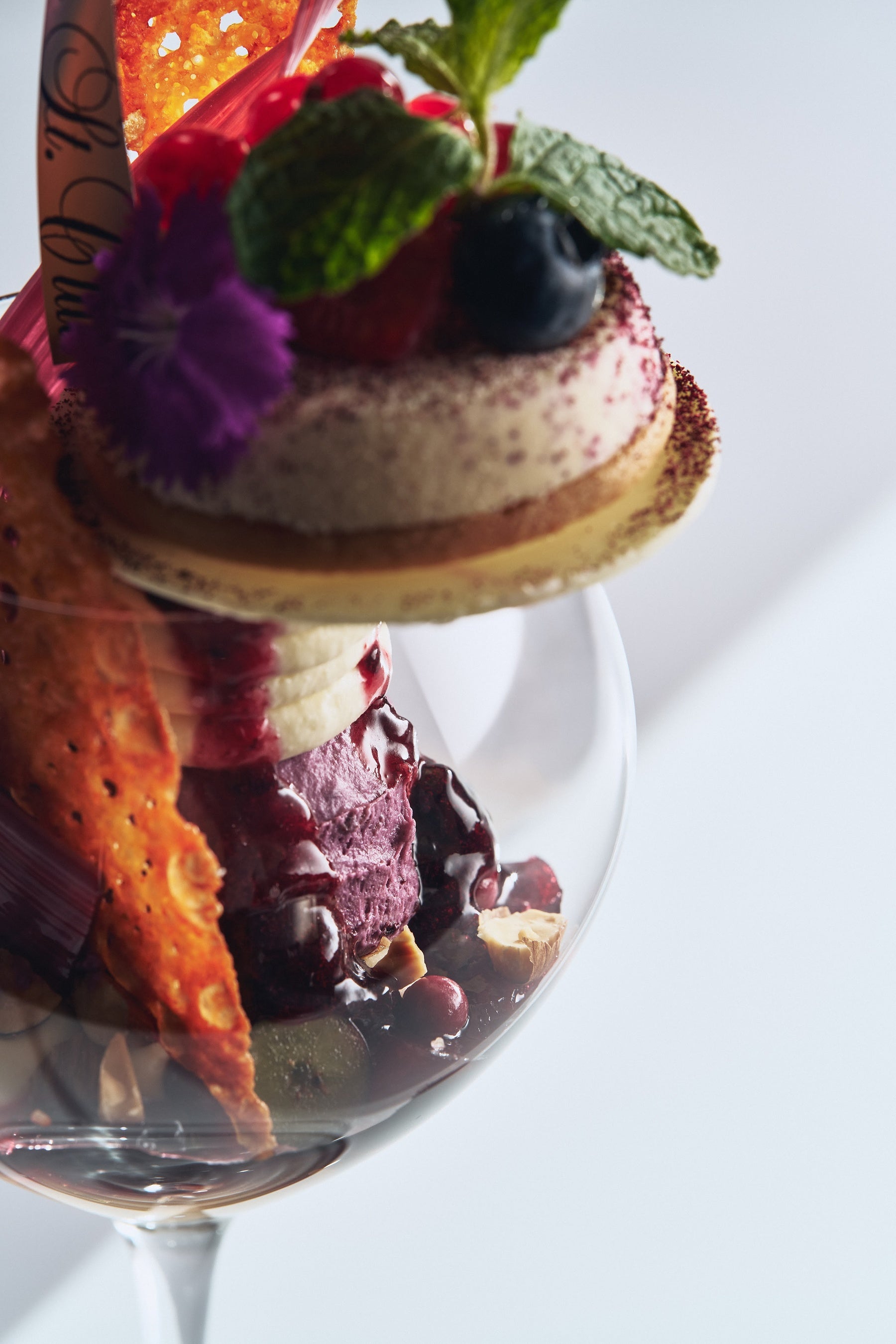 甘酸っぱいブルーベリーや、数種類のフロマージュ、不老長寿の果実と称される北海道のハスカップのパルフェ。ブルーベリーをメインに、クリームチーズ、マスカルポーネ、フロマージュブラン、チェダーチーズなど様々なフロマージュを異なるテクスチャーに仕上げ、なめらかさ、コク、酸味、塩味を演出しています。