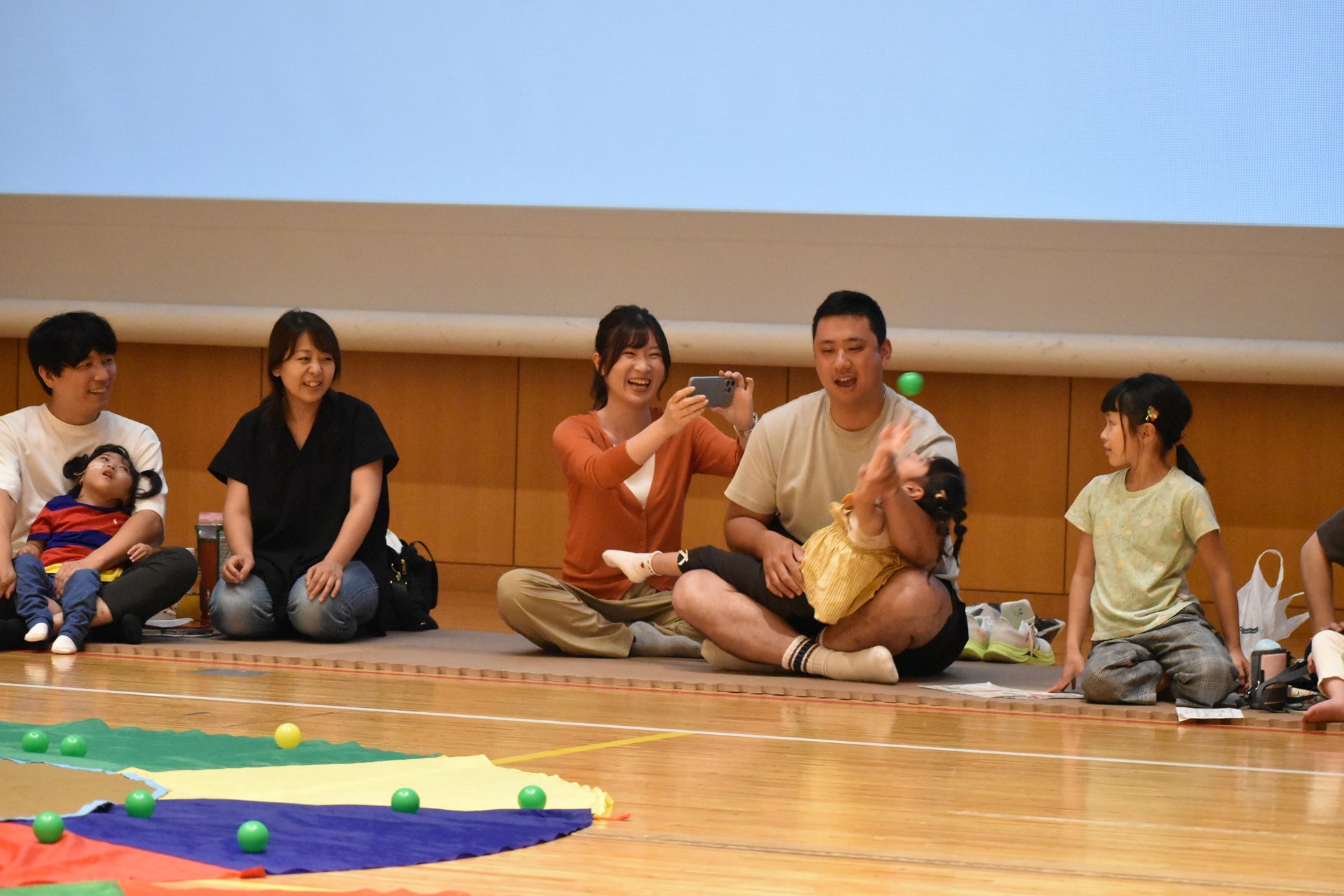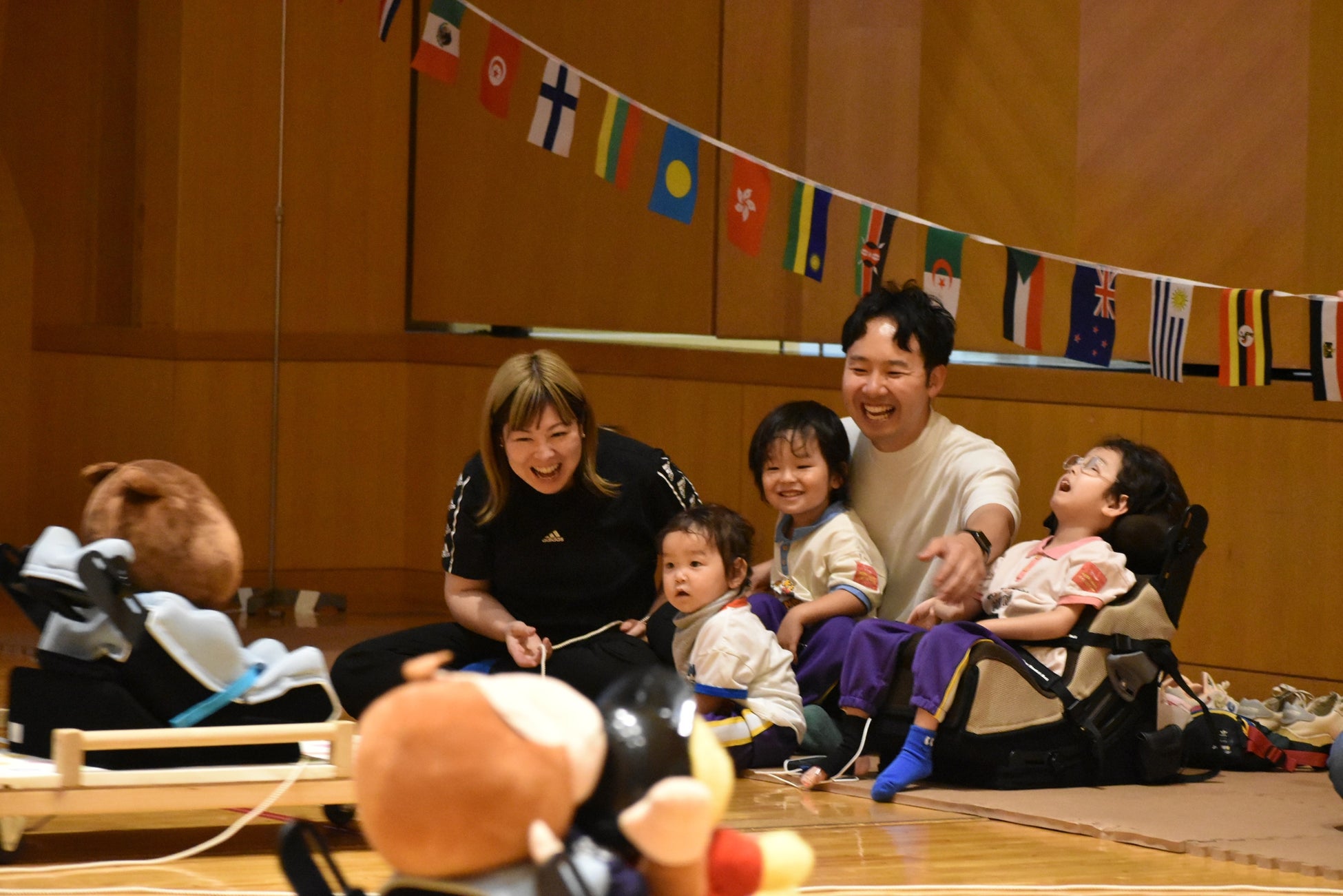本イベントに、28組の重症心身障がい児の家族が紅白に分かれて、オリジナル種目の運動会に参加しました。1時間半の間に5つの競技を実施し、重い障がいを抱えていても家族と一緒に参加できる競技や、家族やきょうだいが本気で参加する競技、隣に座るお友達家族と協力して参加する競技などバラエティに富んだ運動会のプログラムで会場は熱気と笑顔に包まれました。