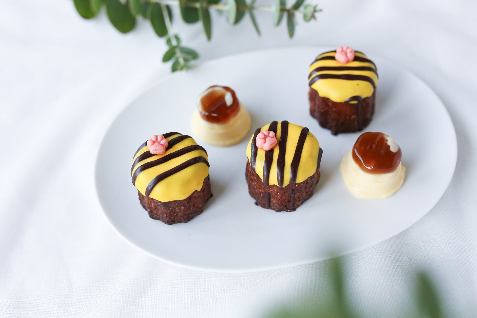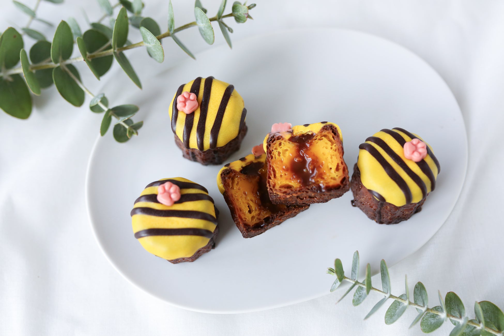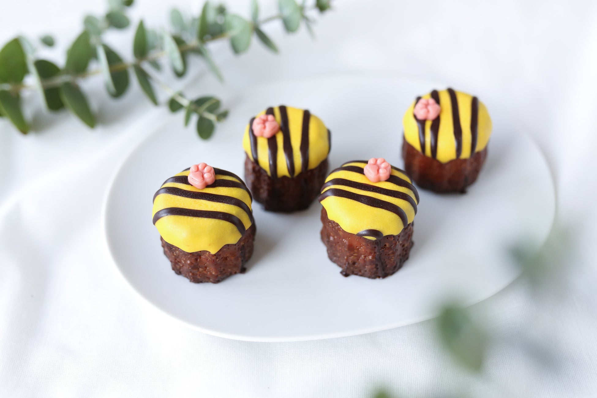 大阪といえば「トラ」!それをイメージしたデコレーションには、チョコレートで出来たピンクのかわいい肉球がトッピング。トラ柄は、見ているだけで楽しくなってくる。明るいエネルギーがいっぱい詰まったカヌレです。