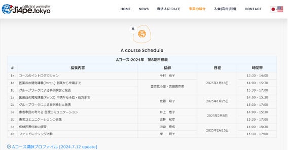 Ji4peでは国際医薬品開発教育認定機関であるPharmaTrain Federation(https://www.pharmatrain.eu/)認定の国際拠点(Centre of Excellence:CoE)として、国際的な教育シラバスに準拠した教育をオンラインで提供しており、PPI推進のためにイントロダクションとしてのAコース、患者会や市民団体の組織的リーダーシップを育成するBコース、研究倫理審査委員会に必須の一般の立場で意見を述べる一般委員を育成するEコースを提供してきました。また、Ji4peでは製薬企業や関連団体の協力を得て開発者側での意識改革を促す事業も展開しており、コースを履修した患者・市民も参加して意見交換する機会も創出しております。さらに、会員による月例セミナーの一般公開など、社会全体の参画に向けた自主活動も展開しています。今般、一部事業への参加費無料化キャンペーンにより、社会の幅広い層からのご参加につながることを期待しております。